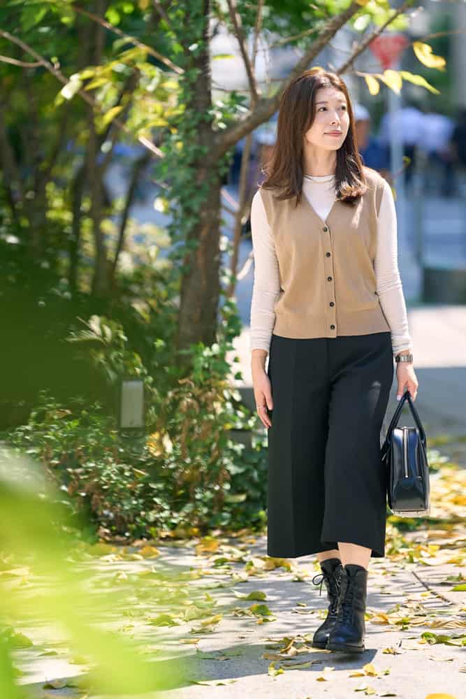 薄手でコンパクトなベストは、カットソーに重ねるだけで秋らしさを演出。このベストは薄手なのでコートのインにも着られ、秋から冬まで長く楽しめるところも気に入っています。ボトムスはミディ丈を選ぶことで足元に抜け感が生まれ、ブーツとも好相性。全体をIラインでまとめ、バッグとシューズを黒で統一すれば、スッキリと大人っぽくまとまり、スタイルアップも叶います。