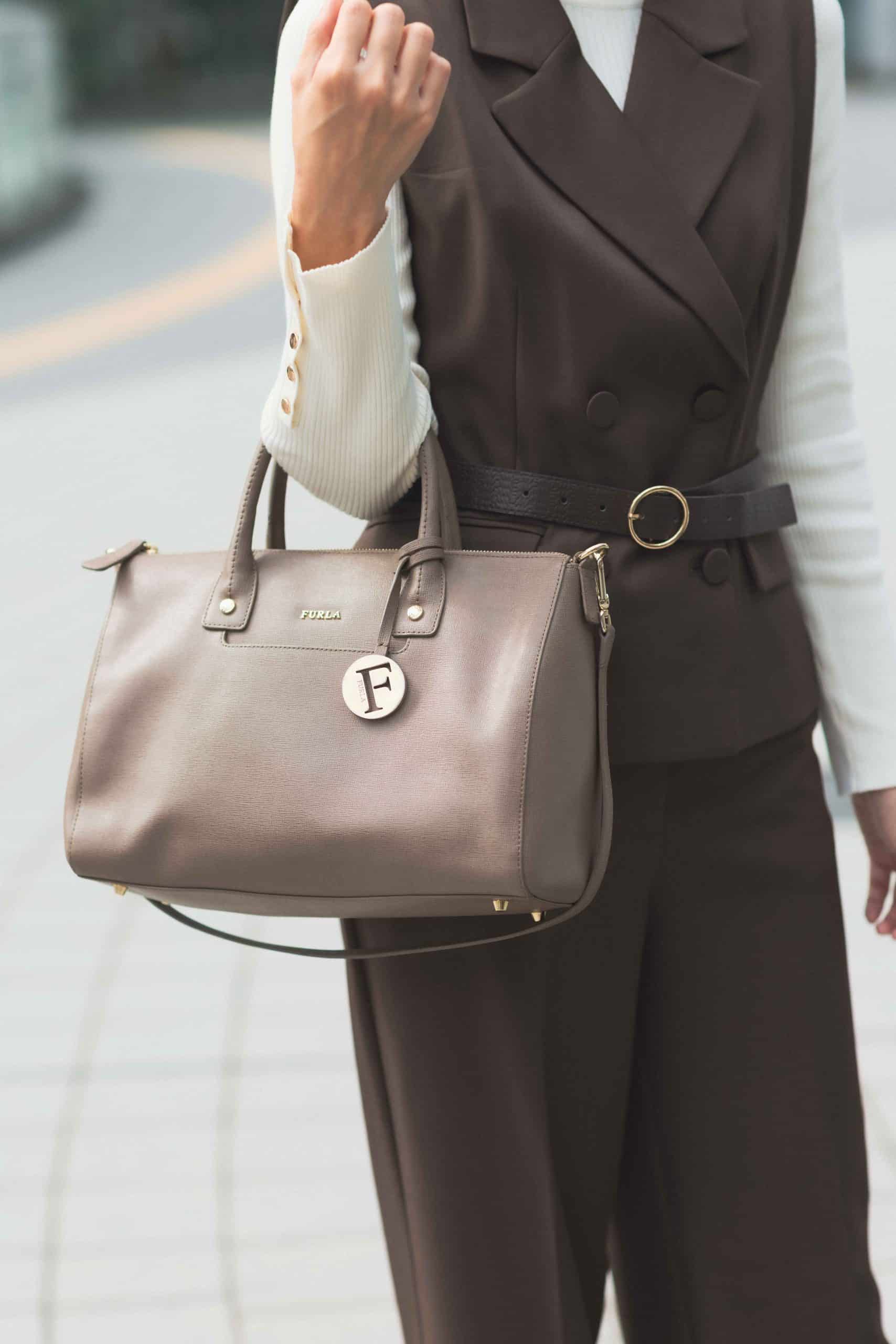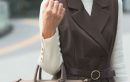 毎年、秋になるとオールブラックになりがち。今季トレンドのブラウンは肌色にも馴染み、顔映えするので友人からも褒められるベストカラー。同色のジレとパンツのセットアップ風スタイルはクール見えしがちですが、肩幅が小さめなデザインなので華奢見えし、フロントの丸いカットが女性らしさをプラスしてくれます。フォーマル感が強いので軽やかなカゴバッグを合わせ、堅過ぎない印象に。