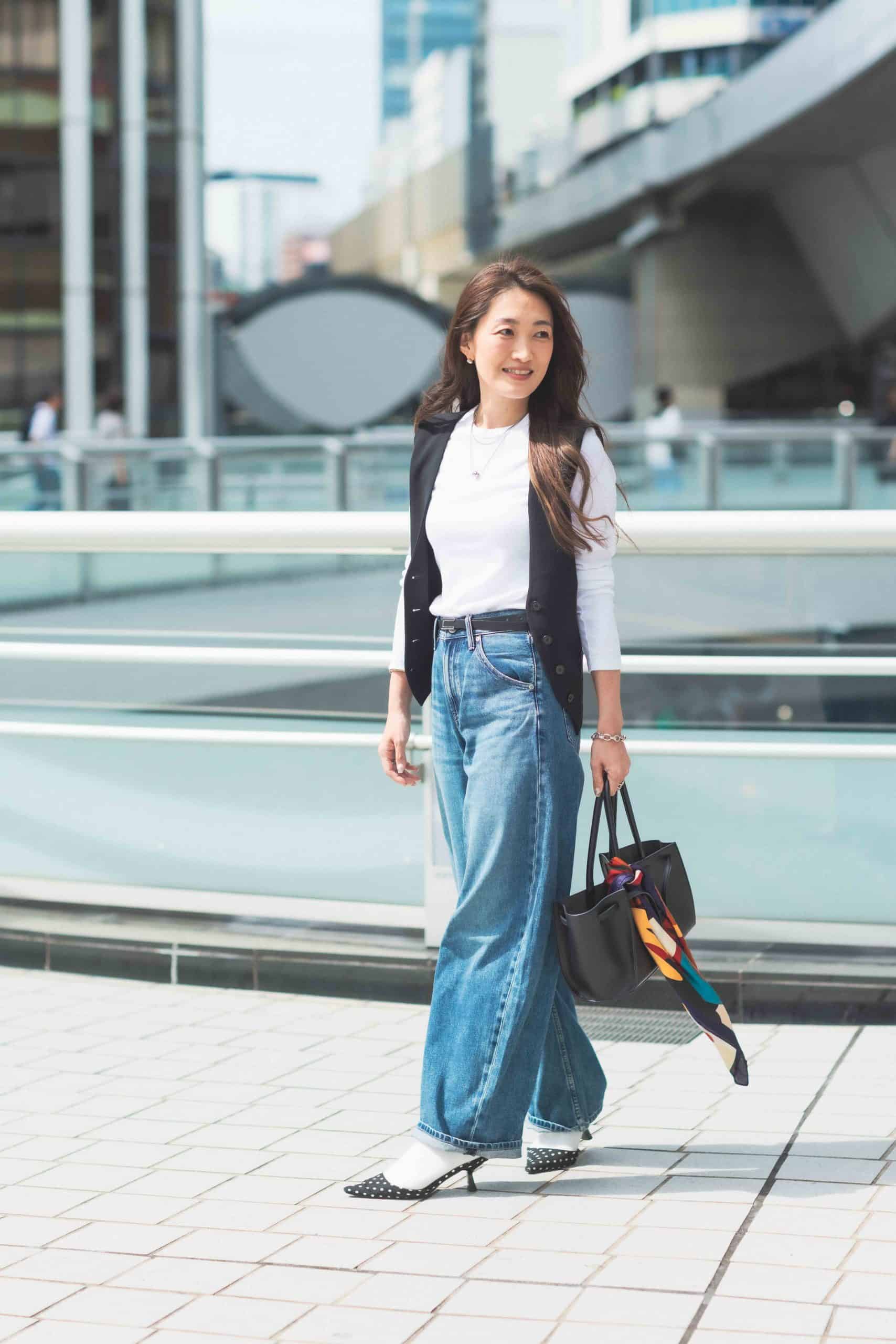 後ろがクロスデザインになっているジレが主役。シンプルなロンTにジレ、デニムですっきりとまとめてスタイルアップしつつ、シンプルだけではメンズライクになりがちなので、足元はドットのパンプスでフェミニンさをプラス。アクセサリーはシルバーをちりばめて全体を明るく見せつつ、華やかなスカーフで秋らしい彩りをプラスしました。
