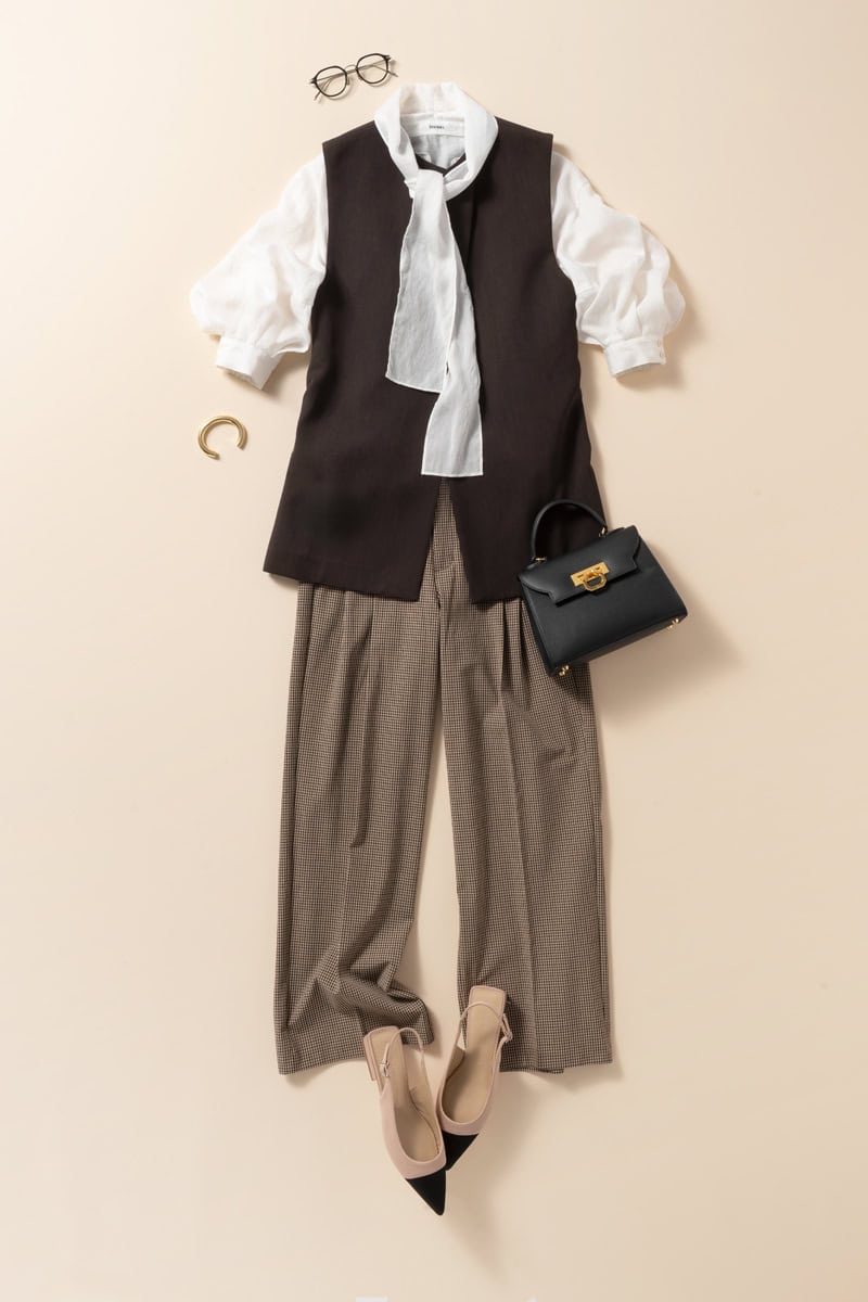 ボウタイブラウスにジレを重ねてきちんと感をプラス