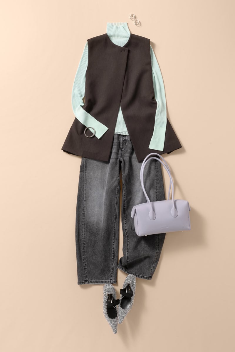 ママONの1日は悪目立ちしたくないけど自分の好きなファッションに身を包んでオシャレを楽しみたい! 淡いミントグリーンが映えるシアー素材のニットならいつものカジュアルコーデの洗練度を高めてくれそう。ジレを合わせるだけで一気にカジュアル感が軽減されるから、母としての好感度もキープ。