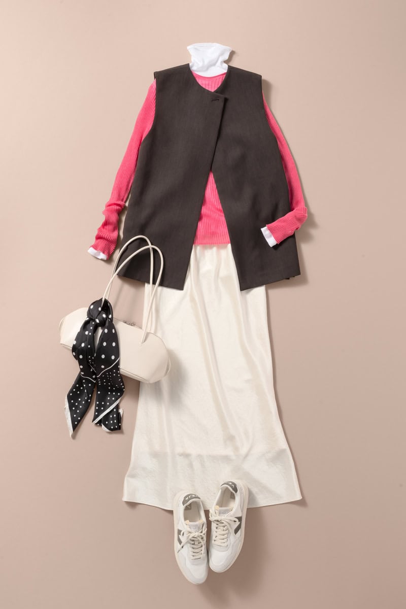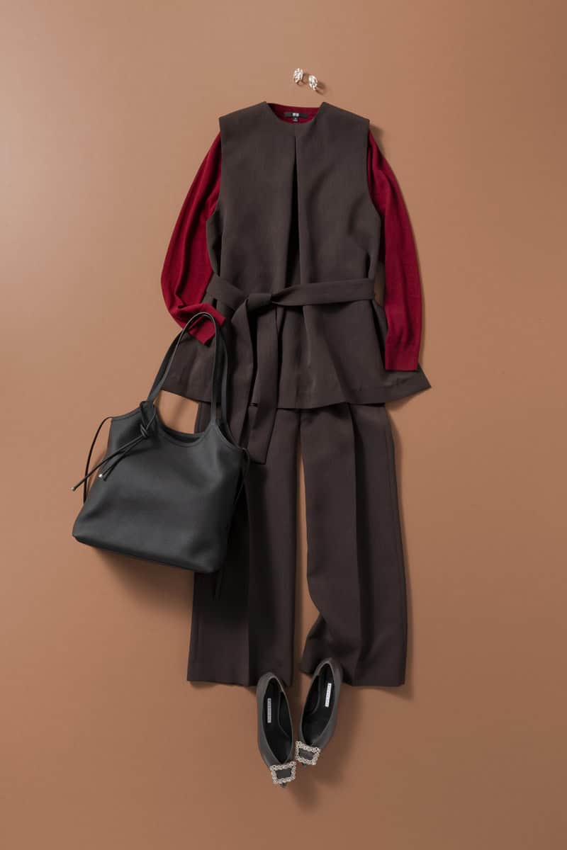ジレの空きを背中側にして、同素材のパンツにリボンでウエストマークすればサロペット感覚で新鮮に着回せます。ブラウンにはトレンドのバーガンディーが高相性! セットアップのリッチな着映え感が知的で柔和な抜け感を醸してくれます。
