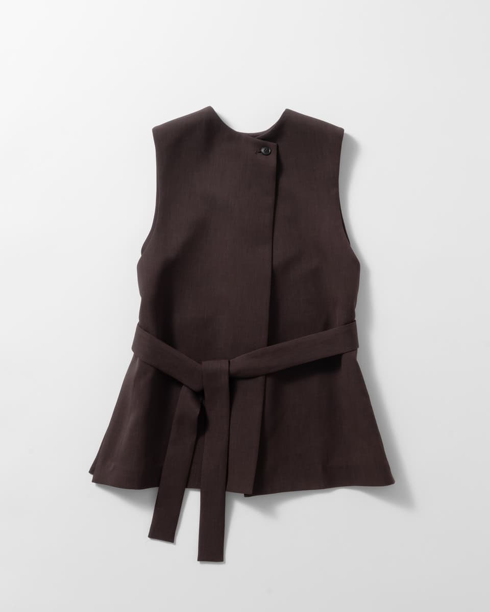 季節の変わり目に活躍するジレはスタメンハオリとして黒や白などの定番色を愛用している人が多いのでは? もしこの秋買い足すならトレンドのブラウンがおすすめ。前後どちらでも着られる2WAY仕様な上にウエストマークができるリボンベルトも付いているので、シーンに合わせて抜群の着回し力を発揮してくれそう!