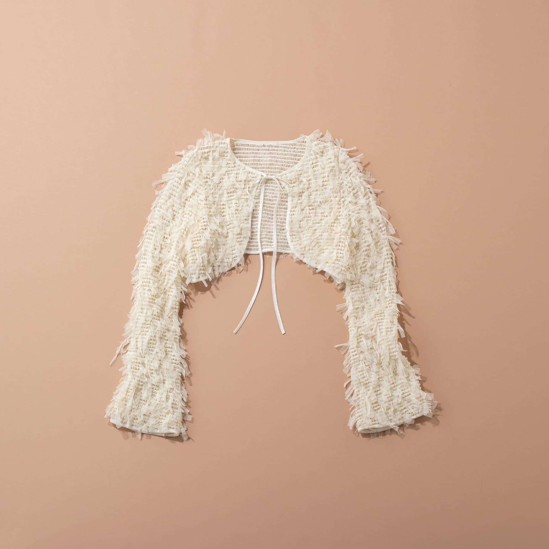 さらっと羽織るだけで旬顔になれる一枚。素材の表情で甘さと華やかさをプラスできるから、シンプルコーデの日も頼れる存在です。素材レイヤードを楽しみつつ、着回し力も抜群なので、もと取れ確実のイチオシアイテムです。