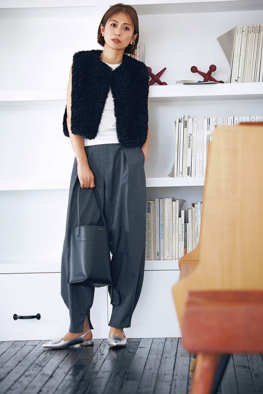 ファーベスト¥39,600(ハイク/ボウルズ)タンクトップ¥12,100※ビスチェとセット価格(ミラ オーウェン/ミラ オーウェン ルミネ新宿2 店)パンツ¥33,000(シーニュ)バッグ¥47,300(オルセット/オルサ)シューズ¥36,300(ファビオ ルスコーニ伊勢丹新宿本店 本館2 階 婦人靴)ピアス¥28,600(プラウ)イヤカフ¥13,200(シンパシー オブ ソウル スタイル/フラッパーズ)