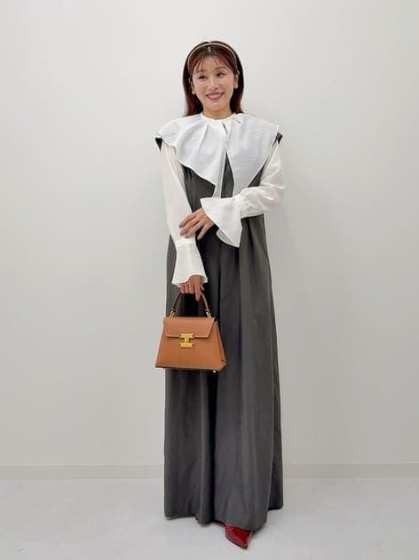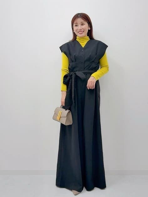 インナーに重ねても、1枚で着ても美シルエットのオールインワン。リボンでウエストマークすることで脚長効果が期待できます。さらにウエストに配したタックが間伸びした感じを防いで、立体的なシルエットに見せてくれます。これも自宅で手洗いが可能なので、日々愛用できます。