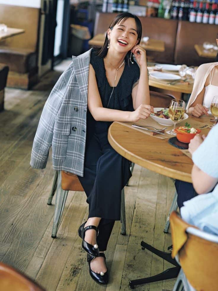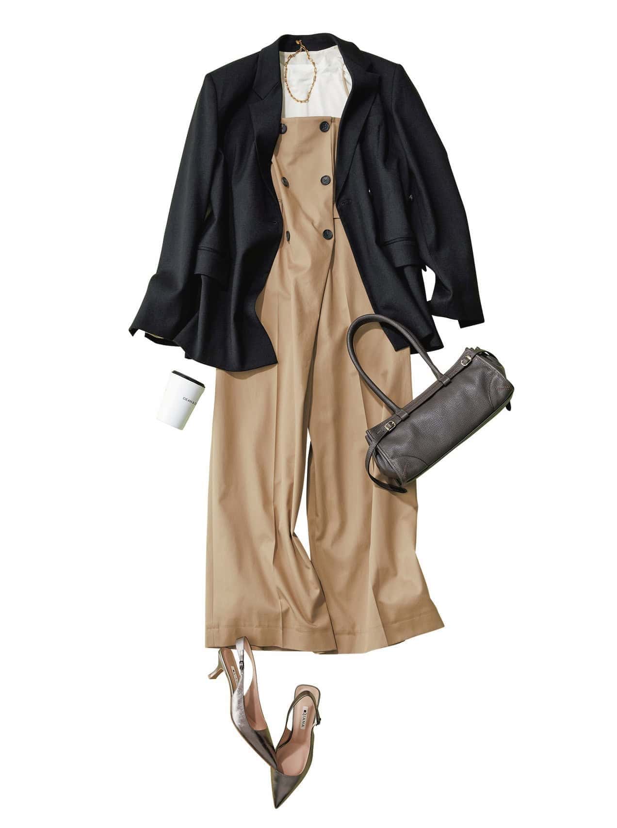 ジャケット¥83,160(テラ/ティースクエア プレスルーム)オールインワン¥45,980(ユナイテッドアローズ/ユナイテッドアローズ 麻布台ヒルズ ウィメンズストア)カットソー¥9,900(MIESROHE/MIESROHE ルミネ新宿1店)バッグ¥23,100(AULENTTI/ドレステリア 渋谷スクランブルスクエア店)パンプス¥17,600(ダイアナ/ダイアナ 銀座本店)ネックレス¥9,900(アビステ)