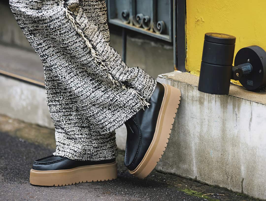 クラシックで落ち着いた雰囲気のあるツイード素材には、カジュアル感が強い靴を合わせるのが老け見えしないコツ。重めな生地を受け止めてくれるボリュームソールがバランス良く仕上がるポイントです。