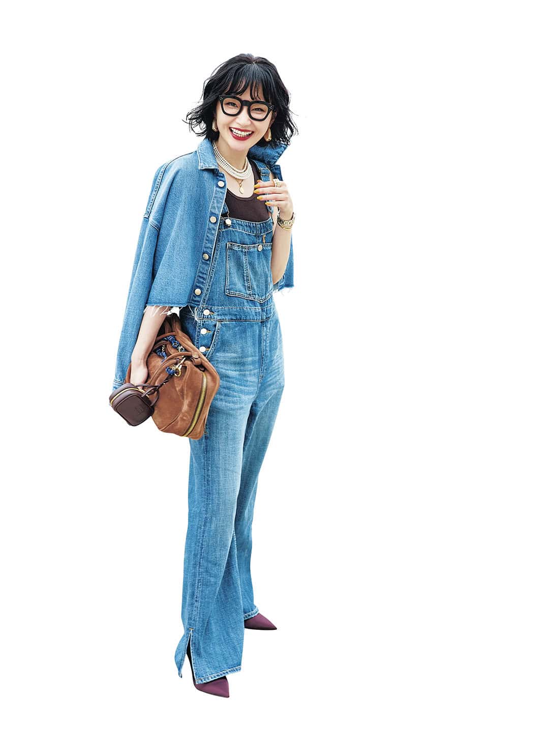 DENIM JACKET/RED CARD TOKYO OVERALLS/RED CARD TOKYO TOPS/emmi BAG/MIU MIU SHOES/ZARA GLASSES/NUEF BAG CHARM、MICRO BAG/MIU MIU JEWELRY/BOTTEGA VENETA、Cartier、IRIS47、GOOSSENS Paris、MARIHA、HERE DITAS