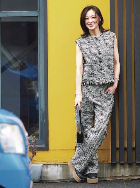 ★ 2.トレンド感と落ち着きを両得したいなら「ツイードジレセットアップ」