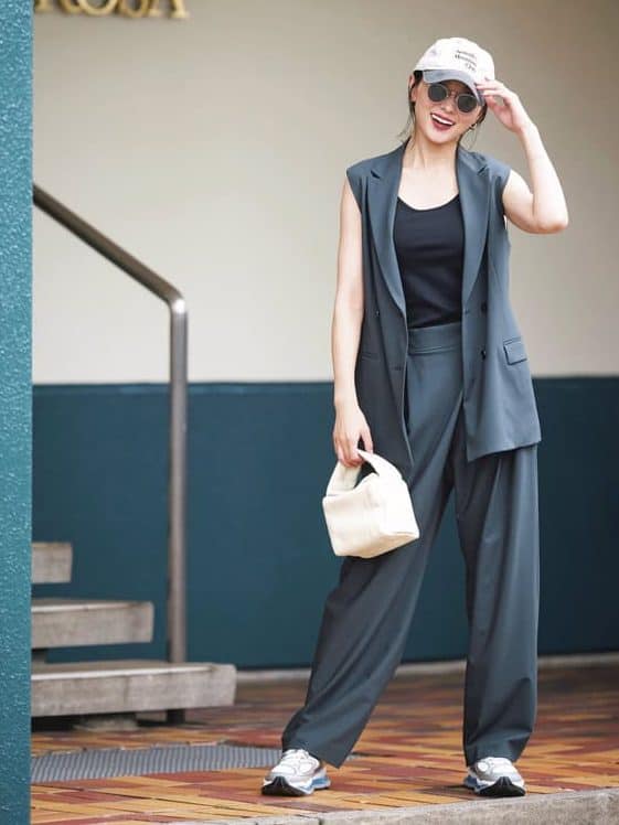 ジレ¥69,000パンツ¥48,400(ともにラヴェイユ/フランドルカスタマーサービス)タンクトップ¥15,400キャップ¥7,700(ともにSEA/エスストア)バッグ¥35,200(バケット バゲージ/アイネックス)スニーカー¥24,200(ニューバランス/ニューバランスジャパンお客様相談室)サングラス¥67,100(アイヴァン 7285/アイヴァン 7285 トウキョウ)ピアス¥29,700(マリハ)