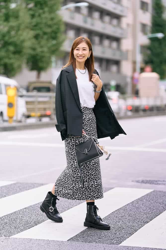 存在感あるレオパード柄スカートは、モノトーン合わせで大人スタイルに