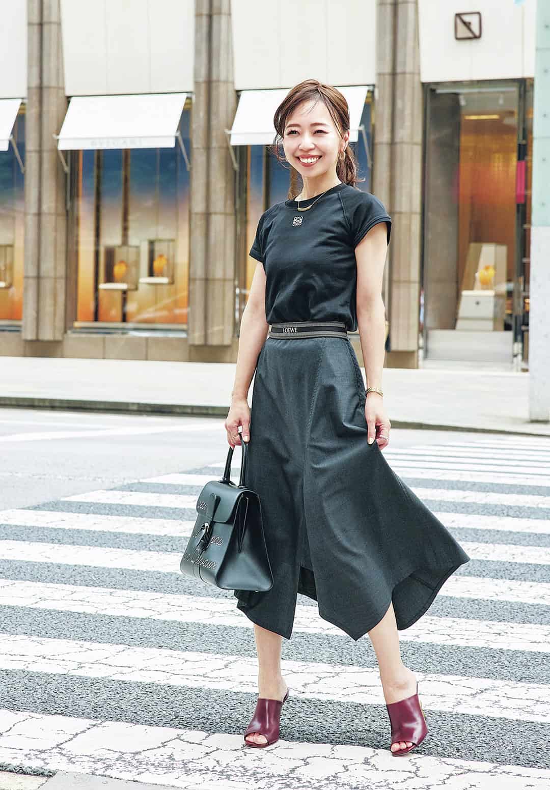 黒でまとめたコーデには、遊び心あふれるルーモアをアクセントに。「ショッピングデーはお気に入りのコーデで出かけるのがルール。洗練されたボルドーのノットサンダルも、コーデの要です」