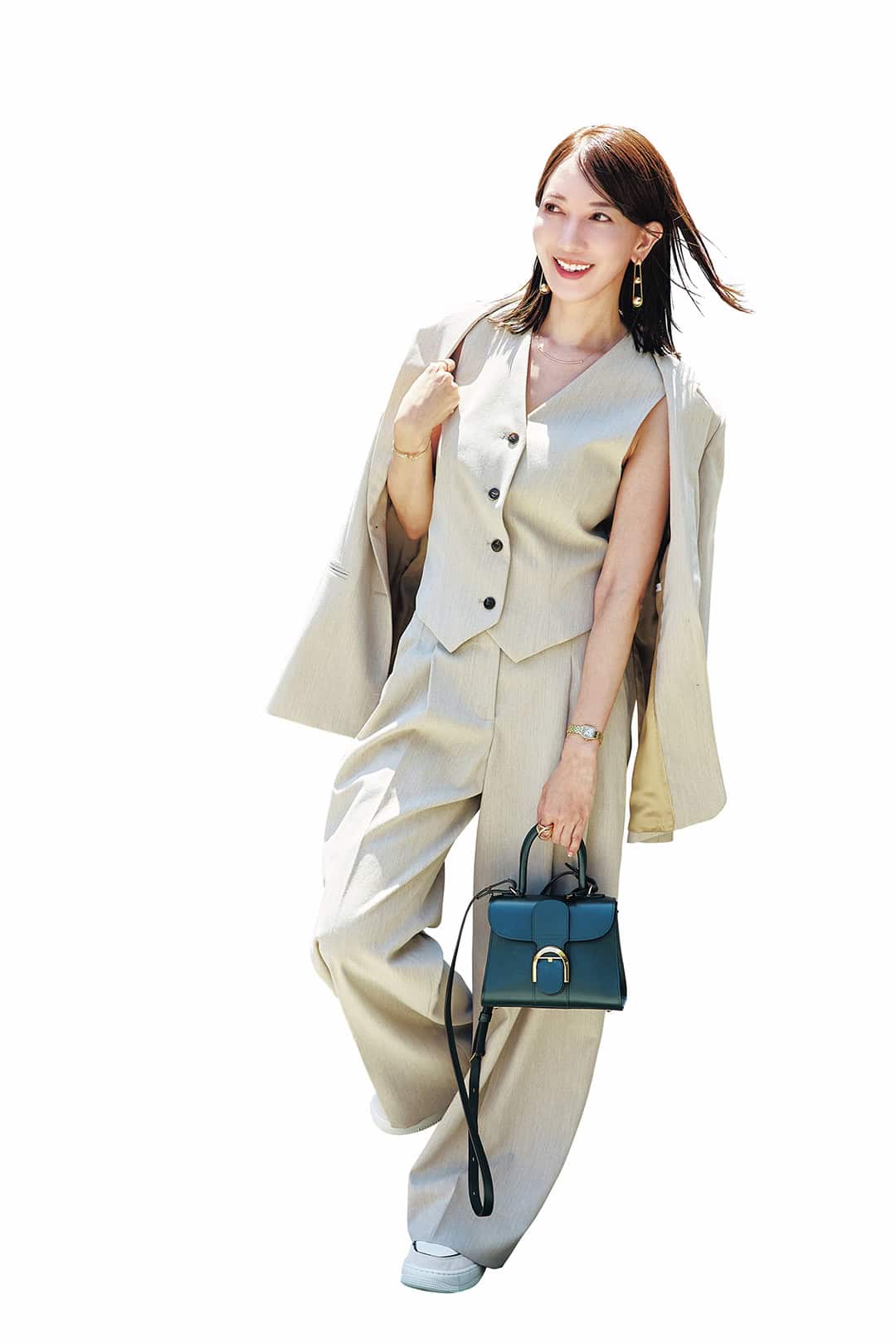 JACKET/By Malene Birger GILET/By Malene Birger PANTS/By Malene Birger BAG/DELVAUX SHOES/NIKE EARRINGS/Tiffany&Co. RING/CHIEKO+, J_Products WATCH/Cartier BRACELET/Tiffany&Co.