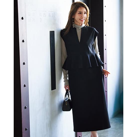 着痩せして見えるペプラムのジャンパースカート。手持ちのカットソーや薄手のニットに重ねて着れば、即スタイリングが完成する優れモノ。ペプラムで腰位置が高く見え、さらに気になる腰回りをオシャレにさりげなくカバー。ジャージー素材だから着ていて楽なのにキレイめ服に見えるのが魅力です。