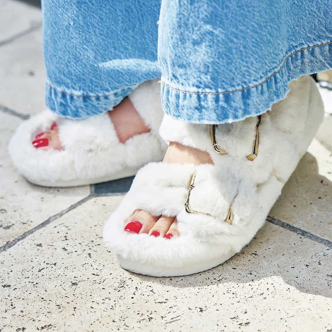 「白T×デニムのカジュアルコーデの外しにミント色のファーバッグをプラス。カラーとファーでコーデに洗練感と華やぎを追加します」