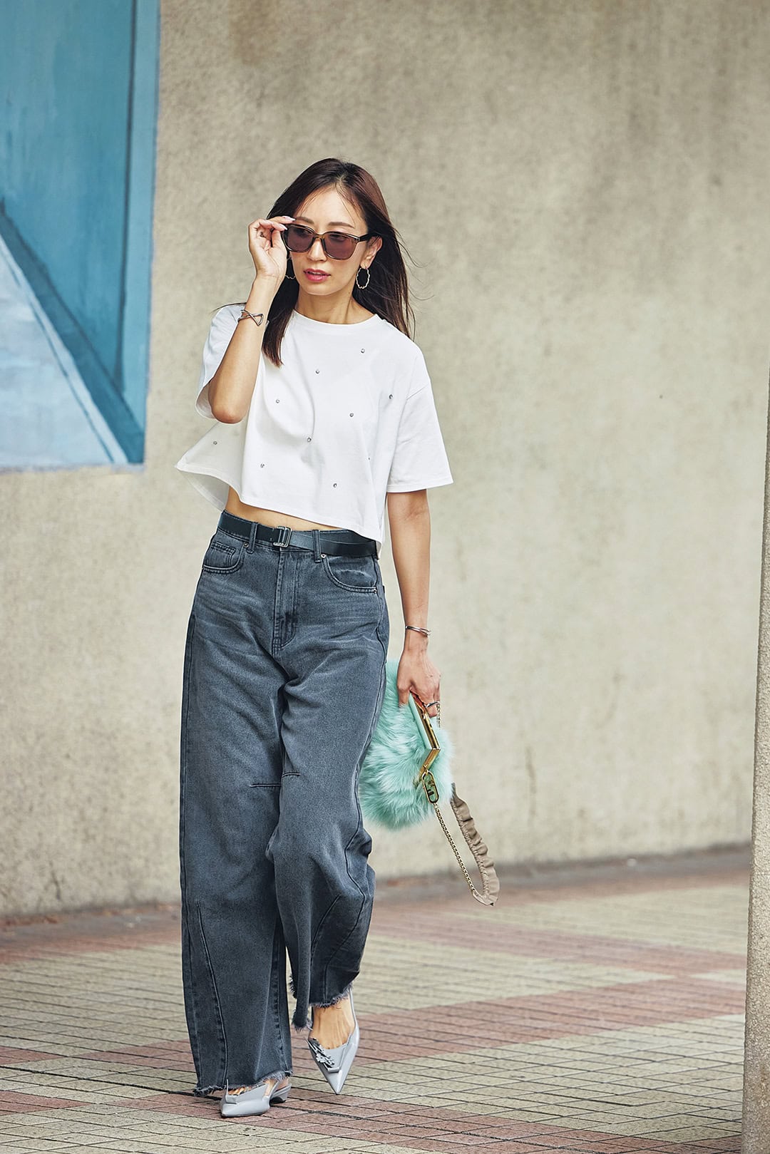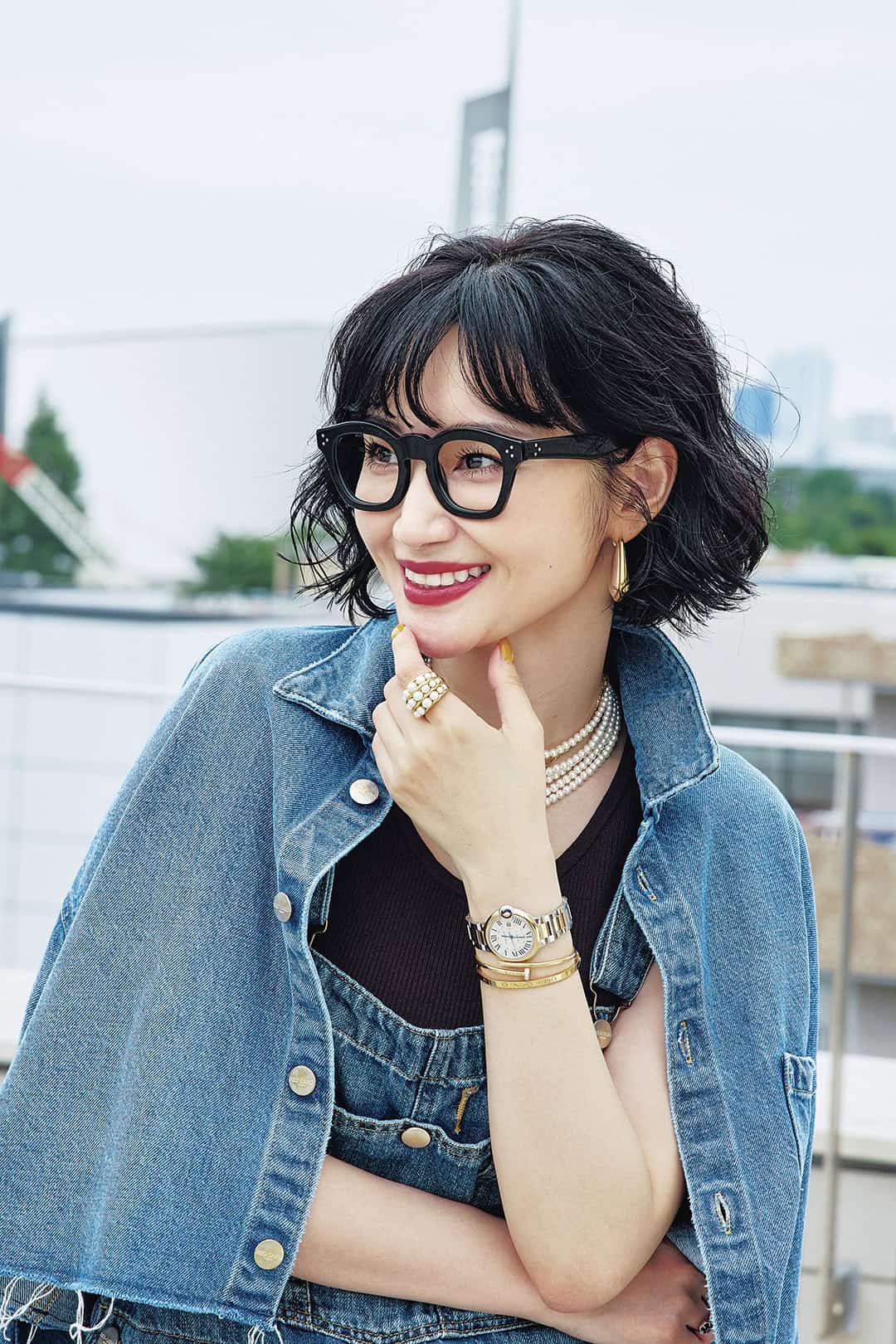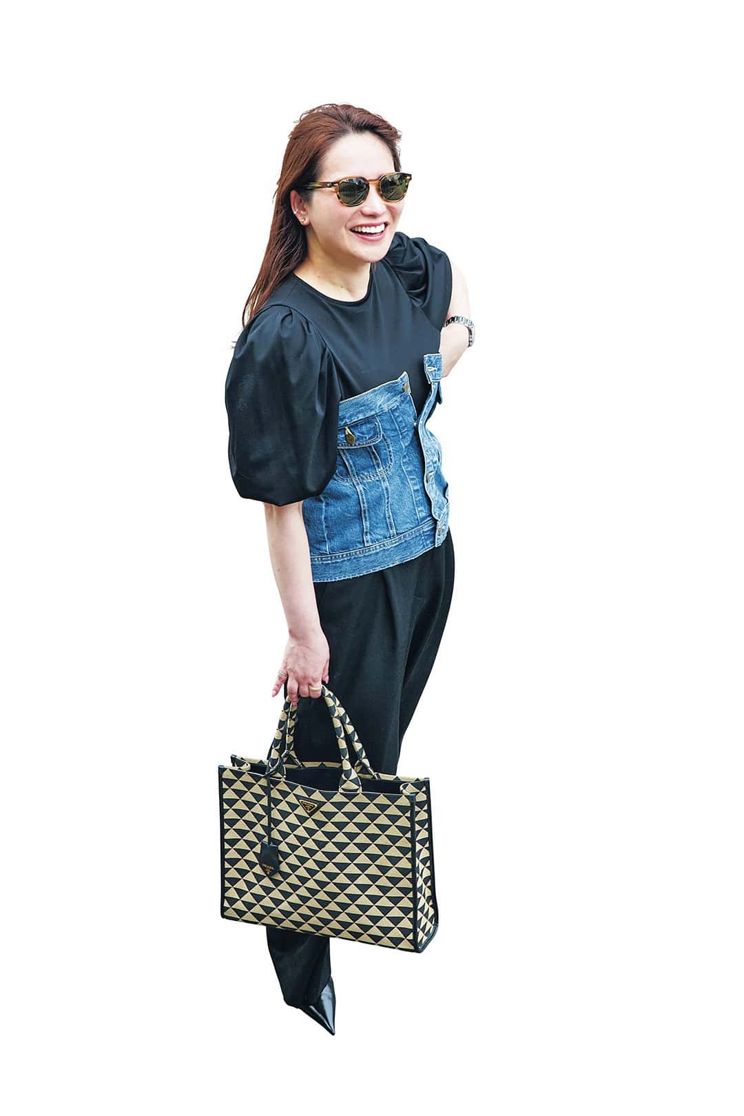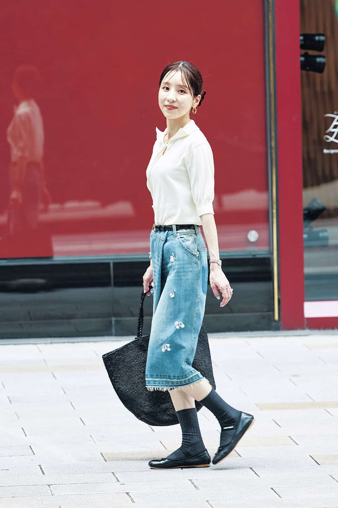 TOPS/akiki DENIM/MIU MIU BAG/LOEWE SHOES/LOEWE EARRINGS/MayuCo. RING/Cartier、Tiffany & Co. BRACELET/Cartier
