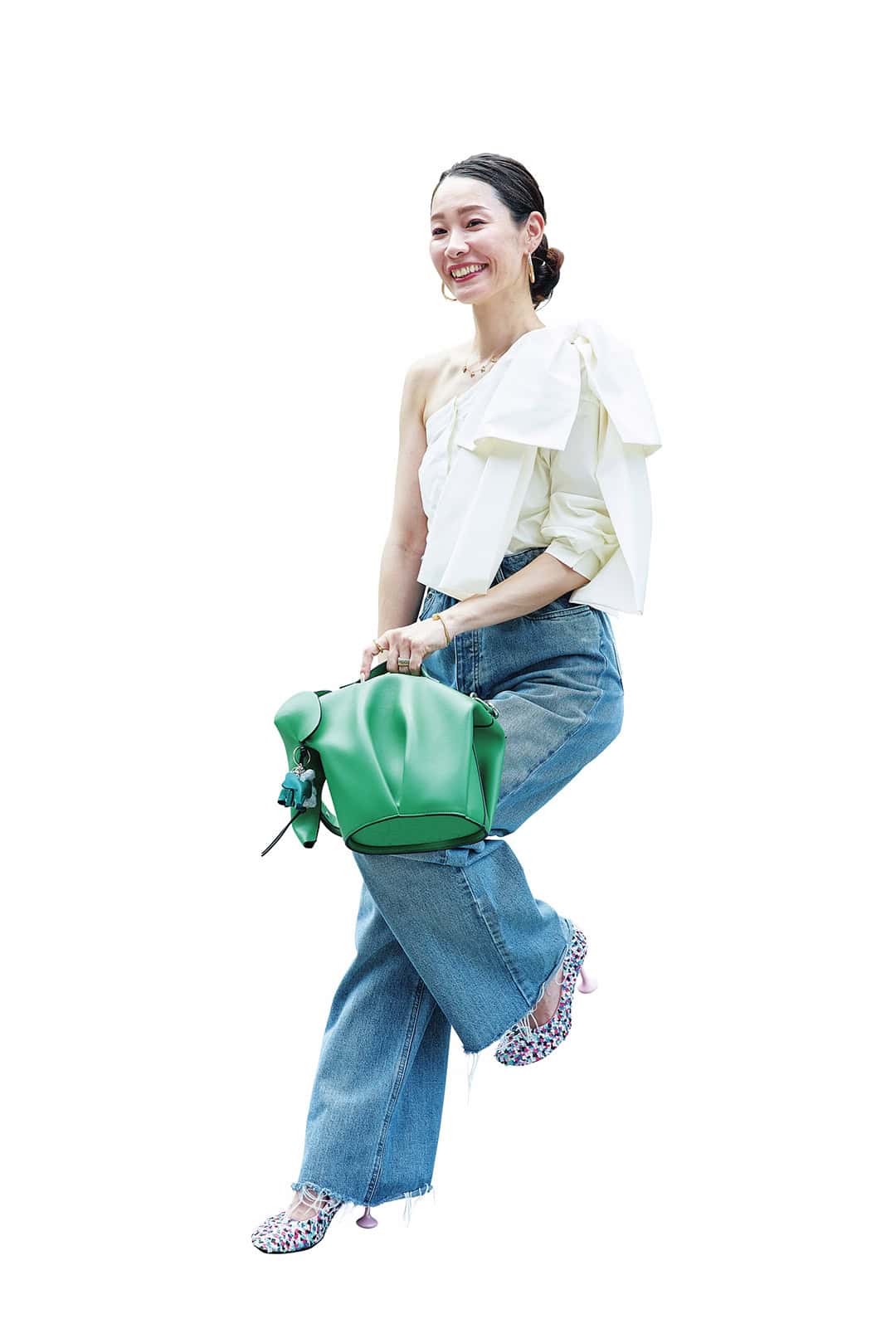 カジュアルな印象のブルーのワイドデニムも、存在感たっぷりのレザーバッグで新鮮な表情に。「大人の遊び心を鷲摑みにされたゾウさんバッグはグリーンとブラウンを色違いで多頭飼い。オシャレも意欲がUPします」