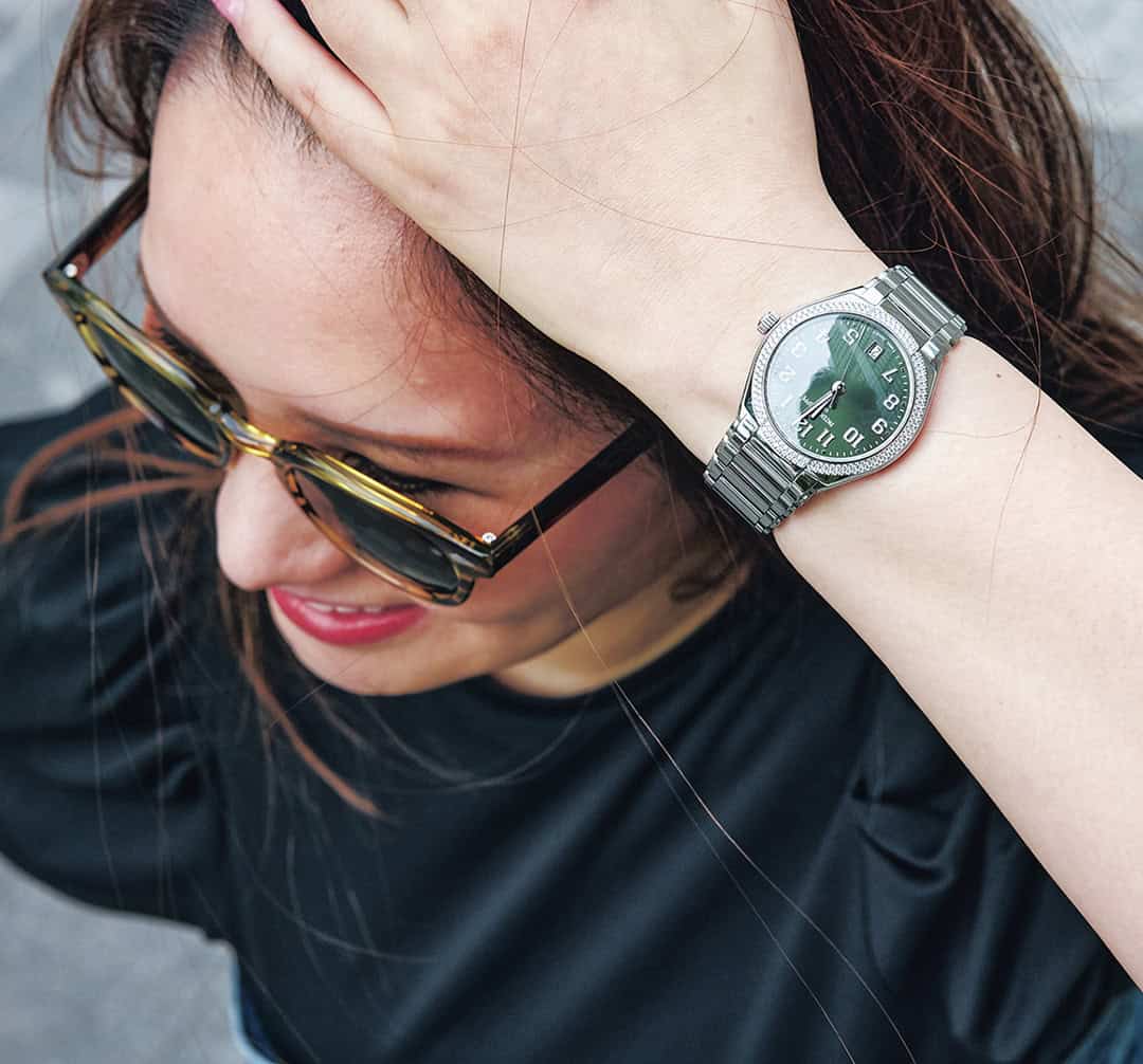 「仕事用のカジュアルコーデもカーキのサングラスとメンズライクな時計をプラスするだけで上級者コーデに格上げされます」