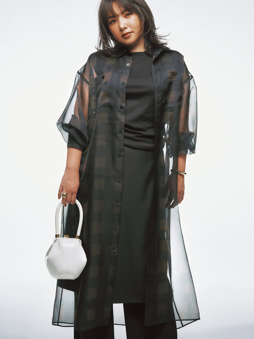 チェックシアーワンピース¥71,500(ハイク/ボウルズ)タンクトップ¥9,790(カデュネ/カデュネ プレスルーム)ラップスカート※パンツ付き¥14,960(ミラ オーウェン/ミラ オーウェン ルミネ新宿2店)パンツ¥37,400(ベイジ,/オンワード樫山 お客様相談室)バッグ¥506,000(ガブリエラ ハースト/ガブリエラ ハースト ジャパン)リング[右手]¥77,000[左手]¥59,400(ともにブランイリス/ブランイリス トーキョー)バングル¥13,750(エイチアッシュ/フォーティーン ショールーム)