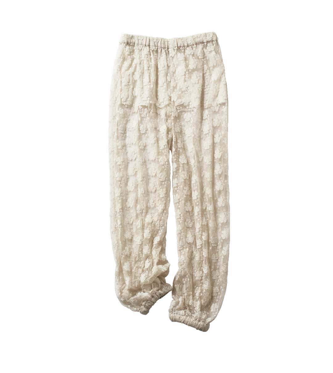 裾がゴムでキュッと絞られたメリハリのあるシアーな花柄のレースパンツ。レースパンツ¥100,100(Sea New York/S&T)