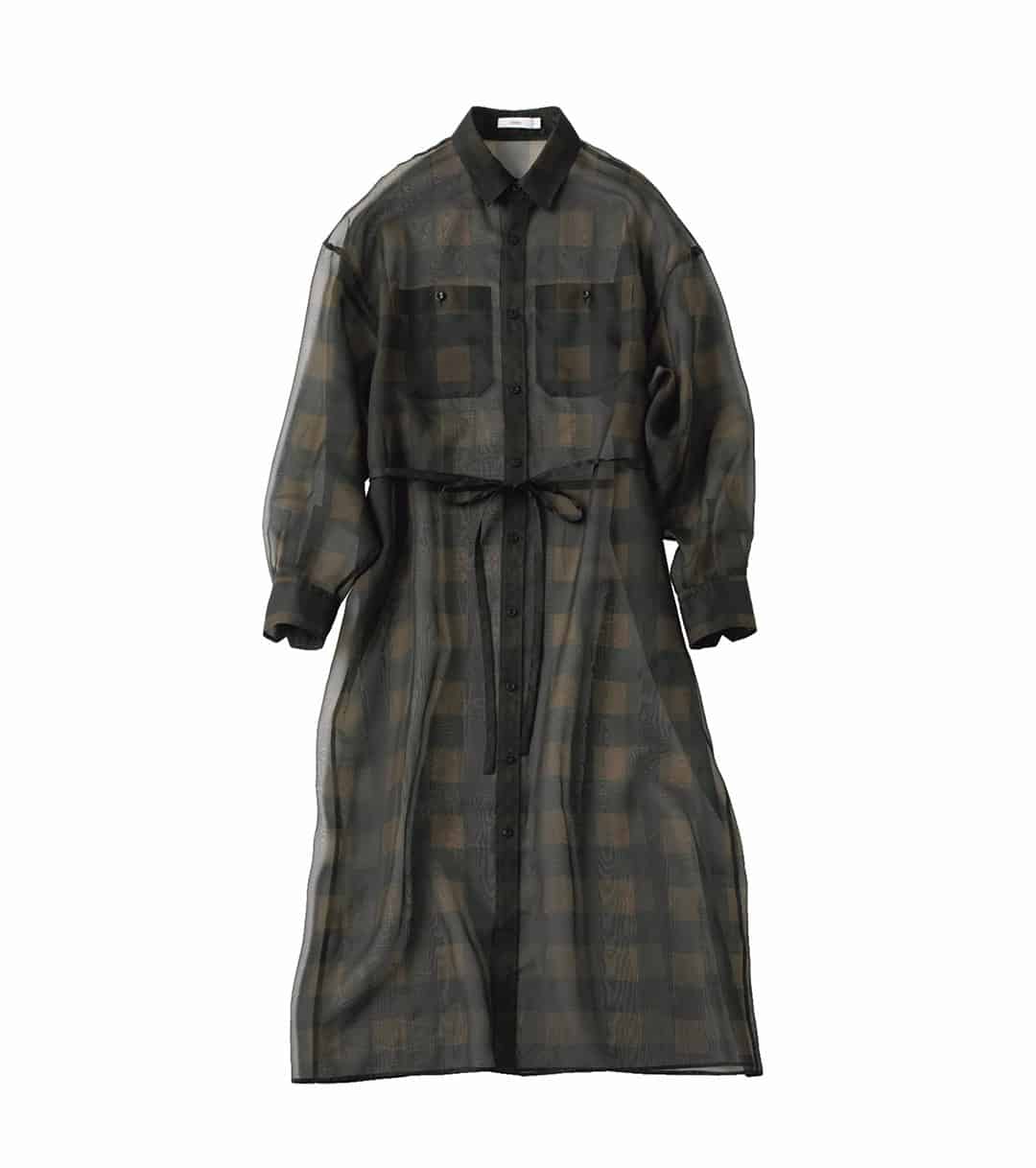 野呂佳代さん着用。旬のチェック柄ワンピース。シアーだから子供っぽくならず着こなせます。シアーワンピース¥71,500(ハイク/ボウルズ)