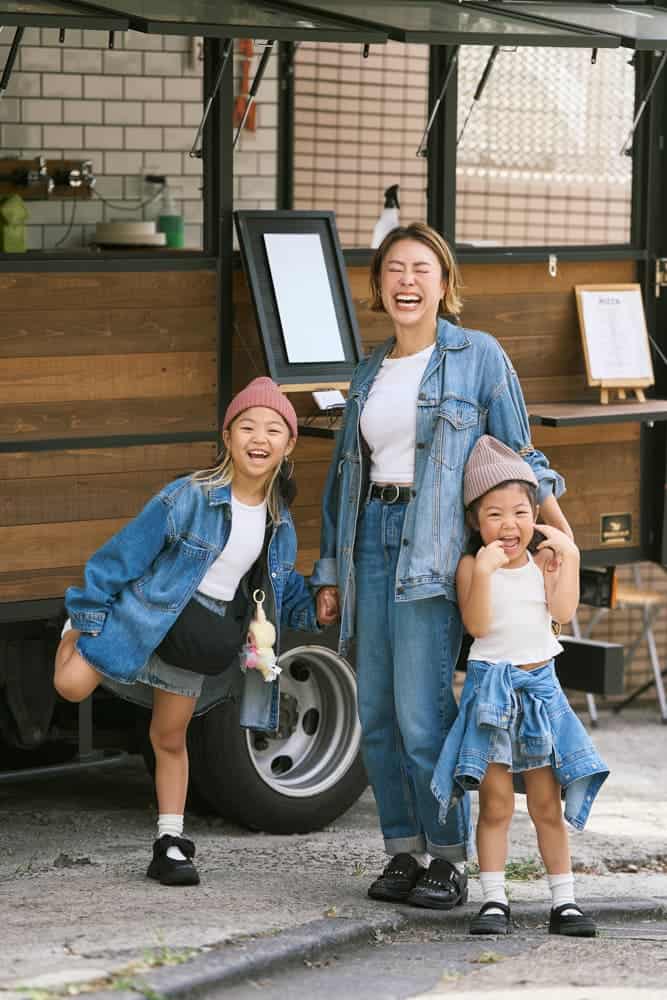 原宿食べ歩きコーデですが、そのまま公園に行くことも想定して動きやすさも意識。デニムを上下セットアップ風にまとめたリンクコーデにしてみました。私は白ソックスとローファーで、娘たちはニット帽もプラスし秋らしさを。子供とのお出かけは思いっきりカジュアルなスタイルを楽しみます。