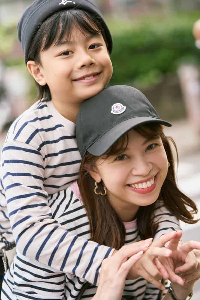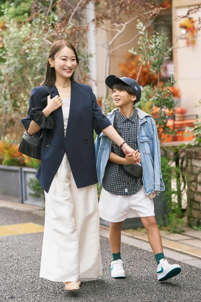 息子と二子玉川で映画を楽しんだあとは、カジュアルなお店でテラスランチを。そんな日の親子コーデは、ネイビー×白でさりげなくリンク。まだ暑さの残る初秋は半袖の日もありますが、私はベロア素材のインナーやゴールドアクセ、息子はデニムジャケットを羽織るなど秋らしさも意識した親子コーデに。気取らないおしゃれをして、秋ならではのお出かけを楽しみます。