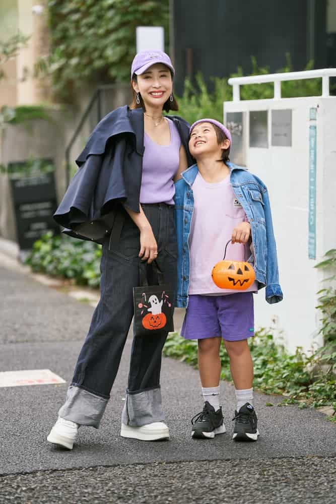 ハロウィンの時期は、毎年テーマパークに行くのが恒例。仮装して楽しむこともありますが、今年は鮮やかなパープルで息子と色リンクをしてみました。ちょっと派手なくらいがテーマパークにはちょうどよい! パープルは男の子でもぐっとおしゃれ見えするからリンクコーデにもおすすめです。