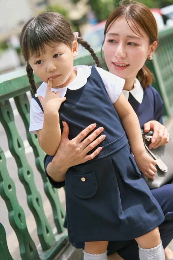 子どもの習い事の日は、きちんと見えて動きやすい万能ネイビーで親子リンクコーデに。娘は白襟ワンピ、私は取り外しできる襟つきトップスで、シーンに合わせてアレンジを楽しんでいます。幼稚園でも人気のフェイラーバッグは、娘にぴったりなサイズ感♡私もハンカチでさりげなくリンクして、楽しんでいます。