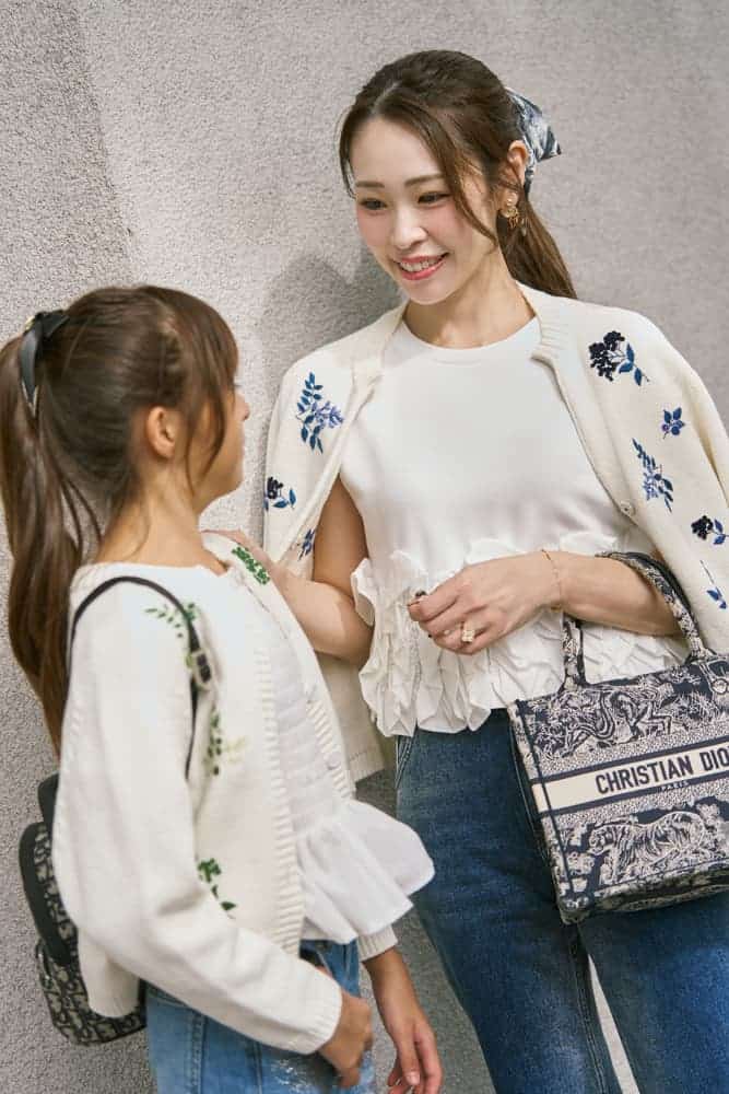 親子で銀座にお出かけをする時は、リンクしながらも気取りすぎないきれいめカジュアルが理想です。白×デニム、ポニーテールで爽やかにまとめ、上品さと抜け感を意識。娘はグリーンの刺繍とバックパックで可愛いカジュアルに、私はブルーの刺繍とブックトートで綺麗めな大人カジュアルに仕上げています。お揃いのカーディガンが映える爽やかコーデで銀座のルワンジュ東京での時間を楽しみます。