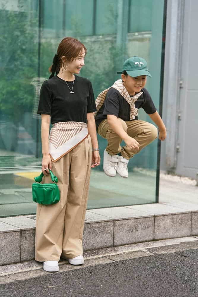 ブラック×ベージュのベーシックコーデにボーダー柄とグリーンをポイントに親子リンク。今季じわじわと気になっているスカーフは腰巻きにしてより今っぽさを出しました。子供と過ごす日は髪をまとめることが多いですが、前髪をカールさせたりリボンのゴムでまとめたりと可愛いポイントもプラスします。秋の芸術鑑賞にぴったりなリンクコーデです。