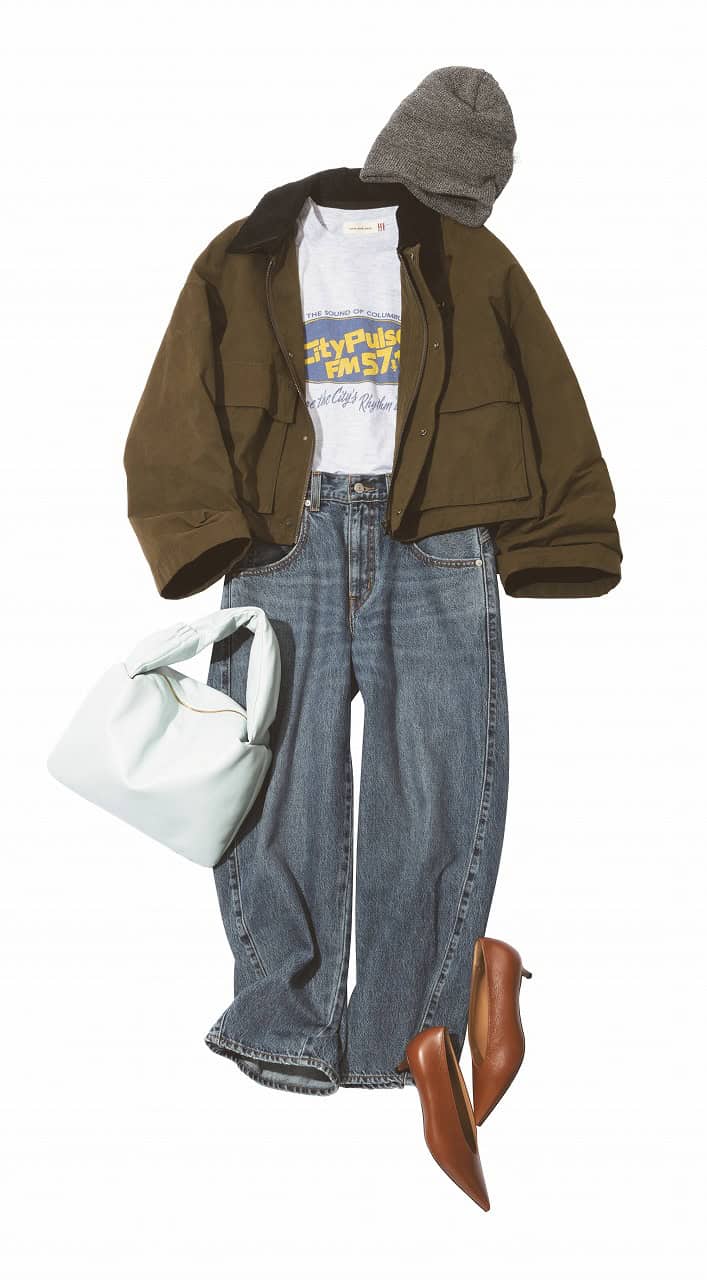 ジャケット¥86,900(サクラ/インターリブ)Tシャツ¥6,380(グッドスピード)デニム¥15,400(リーバイス フォー ジャーナル スタンダード/ジャーナル スタンダード 自由が丘店)バッグ¥80,300(サルチェ/フラッパーズ)パンプス¥64,900(ペリーコ/アマン)ニット帽¥9,900(エイトンステイプルズ)
