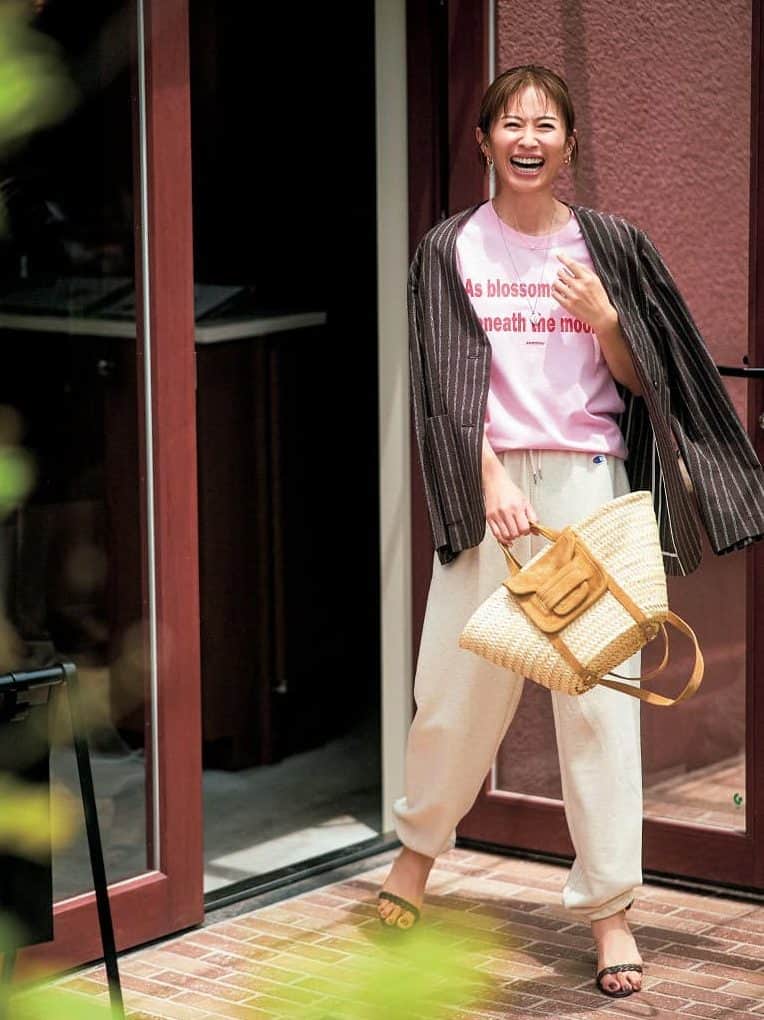 Tシャツ¥6,930(メゾンスペシャル/メゾンスペシャル 青山店)ピアス¥66,000(リューク)イヤーカフ¥19,800(マユ/マユ ショールーム)ネックレス上¥330,000ネックレス下¥79,200(ともにオー/ハルミ ショールーム)ジャケット¥49,500(ザ シンゾーン/シンゾーン ルミネ有楽町店)パンツ¥7,590(チャンピオン/ヘインズブランズ ジャパン カスタマーセンター)バッグ¥93,500(ピエール アルディ/ピエール アルディ 東京)サンダル¥72,900(ネブローニ/マルティニーク ルミネ横浜)