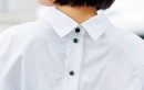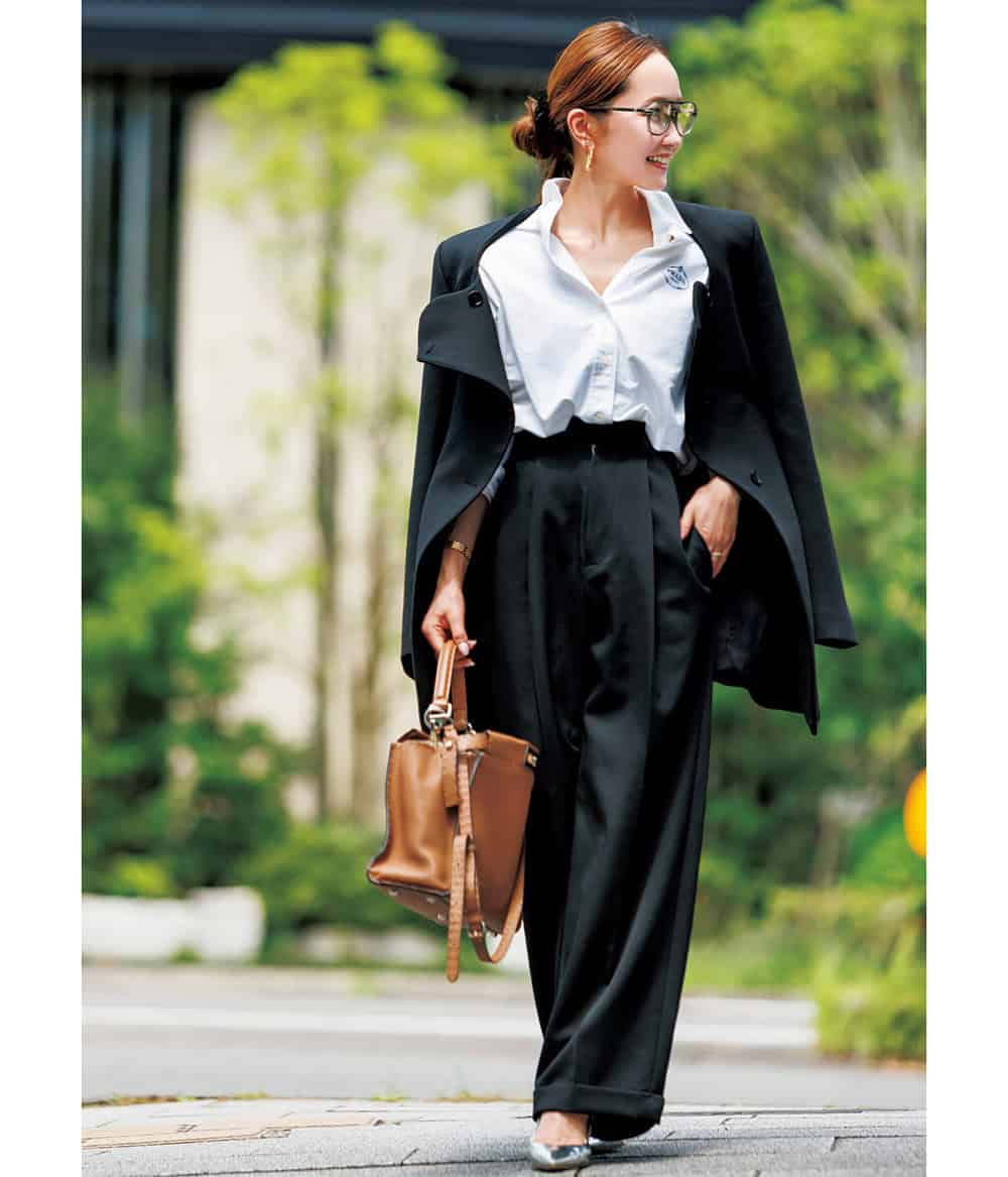 「シャツのボタンを掛け違いにして短か丈にアレンジ。ボタンも上までしっかり留めて、黒パンツを合わせれば格段ときちんと感UP。」(西村真菜実さん 40歳 身長171cm ヨガ講師)