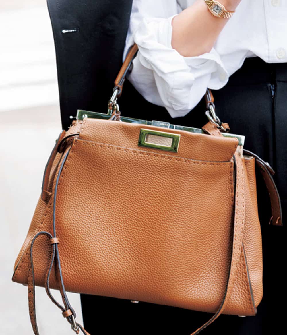 「仕事柄、カジュアルなスタイルが多いので、オフの日はガラッと雰囲気をチェンジ。ブラウン小物を合わせてまろやかに仕上げます。」(内藤絵理さん 45歳 身長155cm pilatesインストラクター)