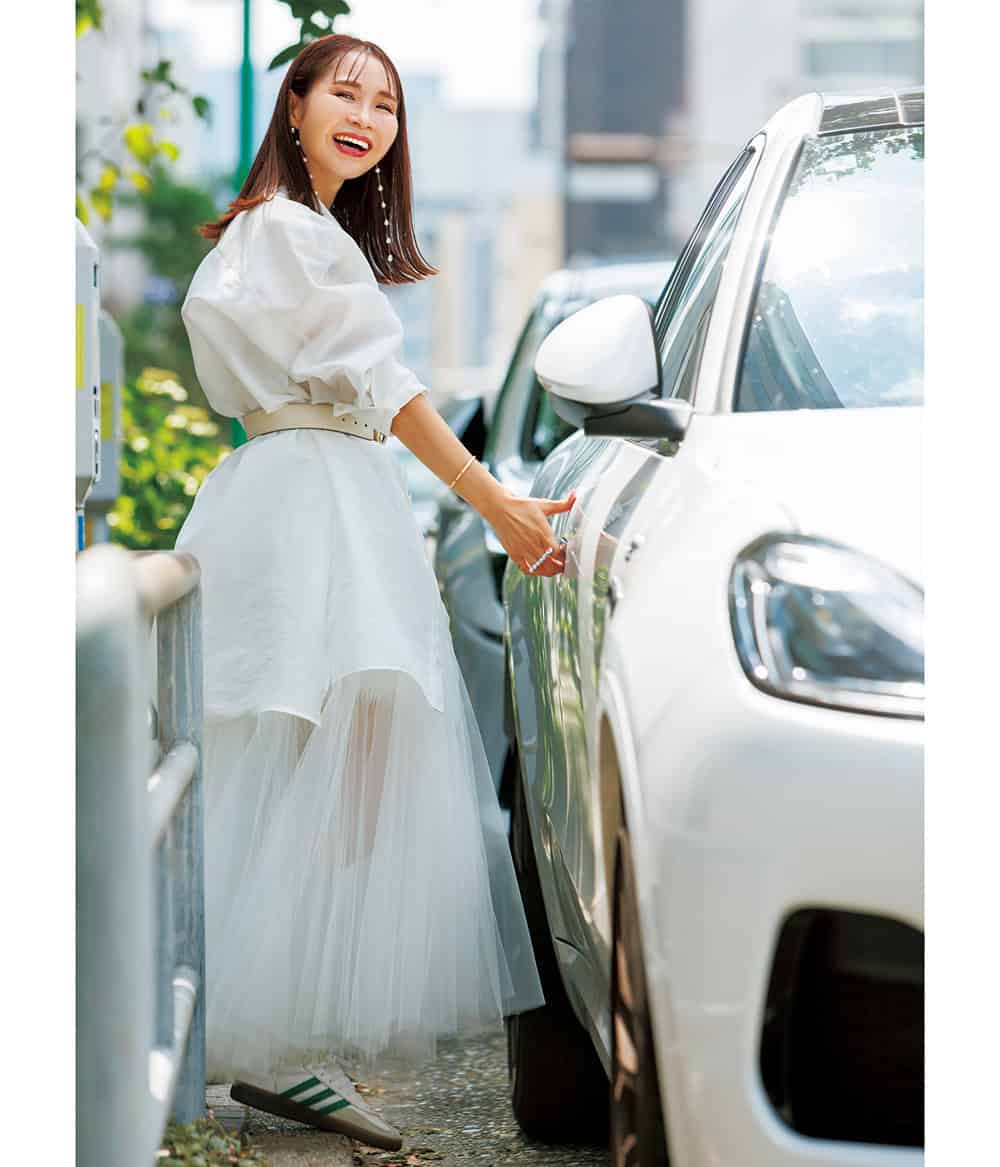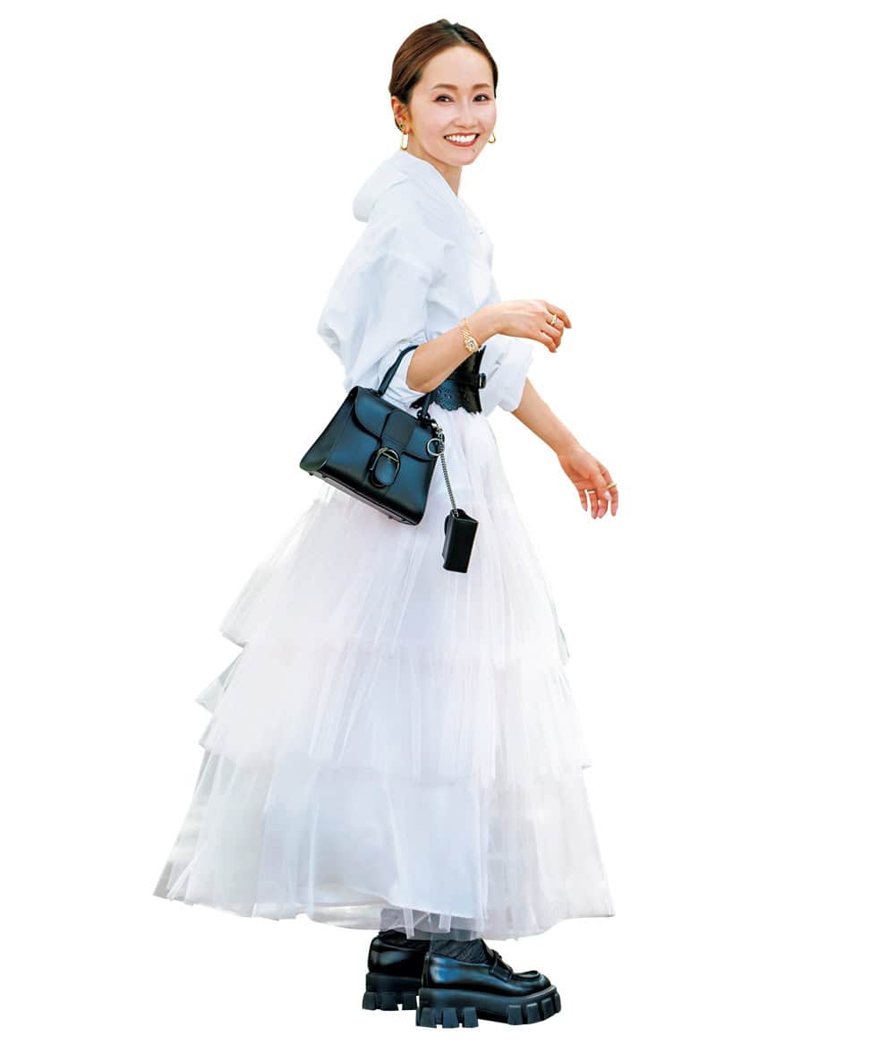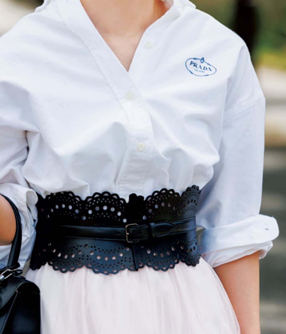 「友人とのランチ会は、淡ピンクのチュールスカートと合わせてドレスアップ。シャツの裾はINして太ベルトでウエストマークします。」(菱田恭子さん 37歳 身長157cm Blueleaディレクター)