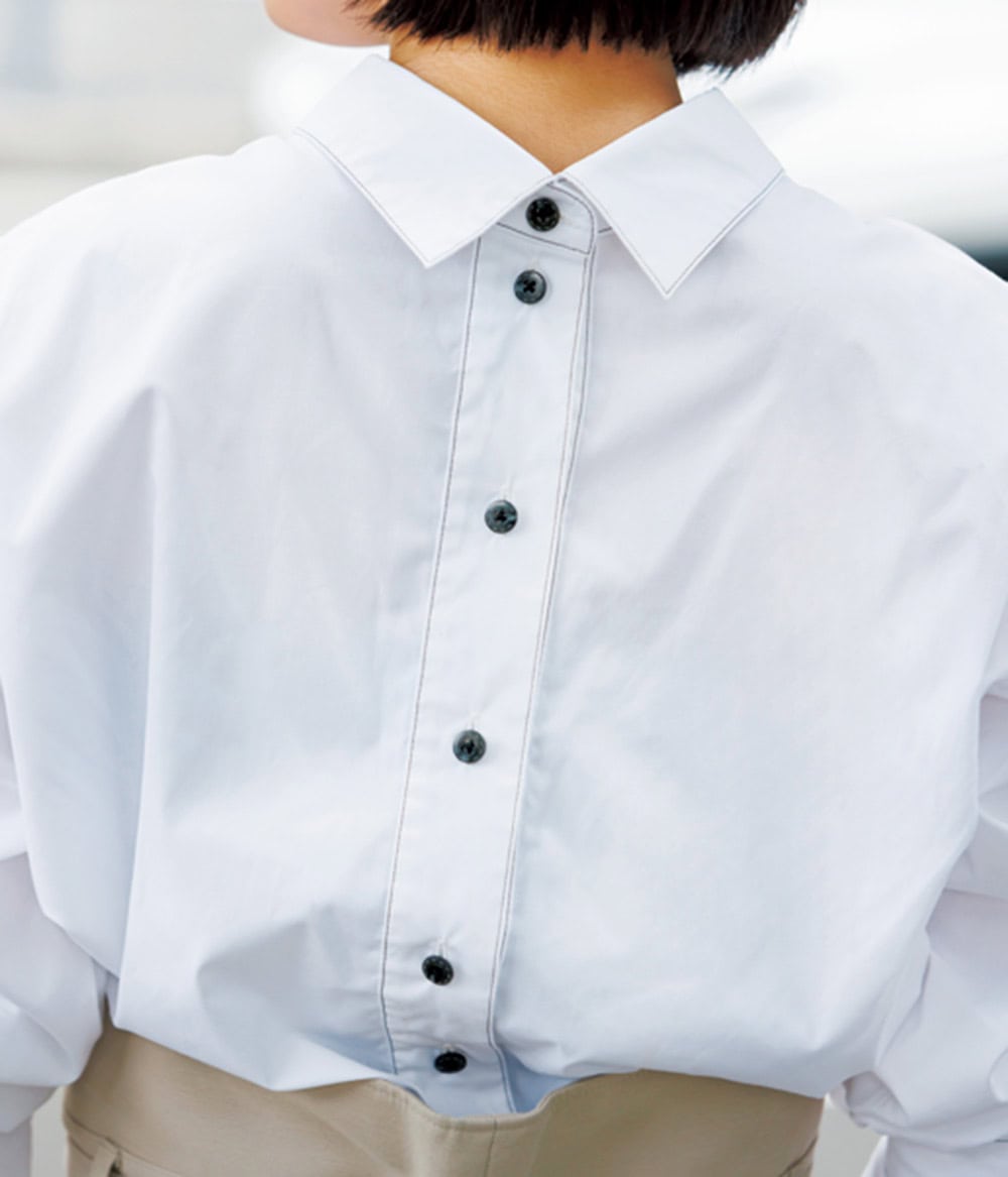 「白シャツを前後逆に。百貨店の人との打合わせなので、黒ではなくベージュパンツを合わせて柔らかさを出すように気をつけます。」(前田広美さん 38歳 身長164cm FREYディレクター)