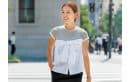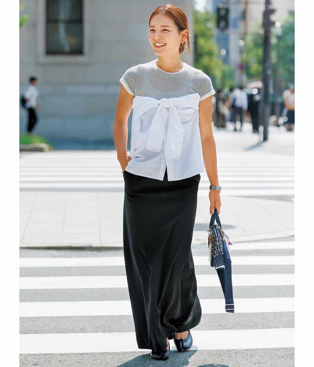 「シャツのボタンを掛け違いにして短か丈にアレンジ。ボタンも上までしっかり留めて、黒パンツを合わせれば格段ときちんと感UP。」