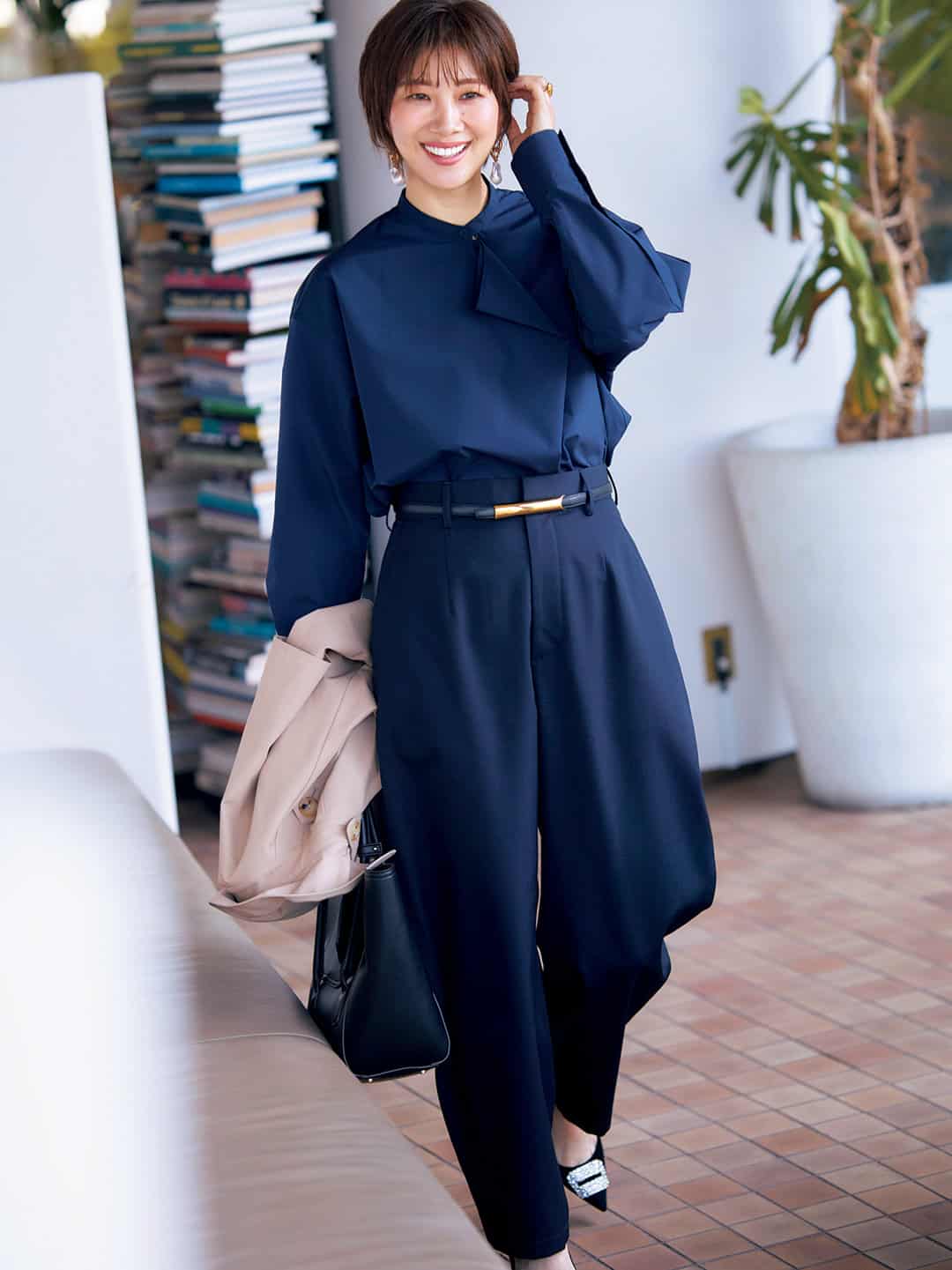 パンツ¥36,300(ロエフ/エイチ ビューティー&ユース)ブラウス¥27,500(hLM/ヒューエルミュージアム 表参道ヒルズ)コート¥66,000(ニコラ ジェンソン/リノウン)バッグ¥26,400〈アンドミューク〉靴¥97,900〈ペリーコ〉ベルト¥22,000(参考価格)〈アトリエアンボワーズ〉(すべてアマン)ピアス¥16,500(ダブル スタンダードクロージング/フィルム)リング¥51,810(参考価格)(オーガスト)