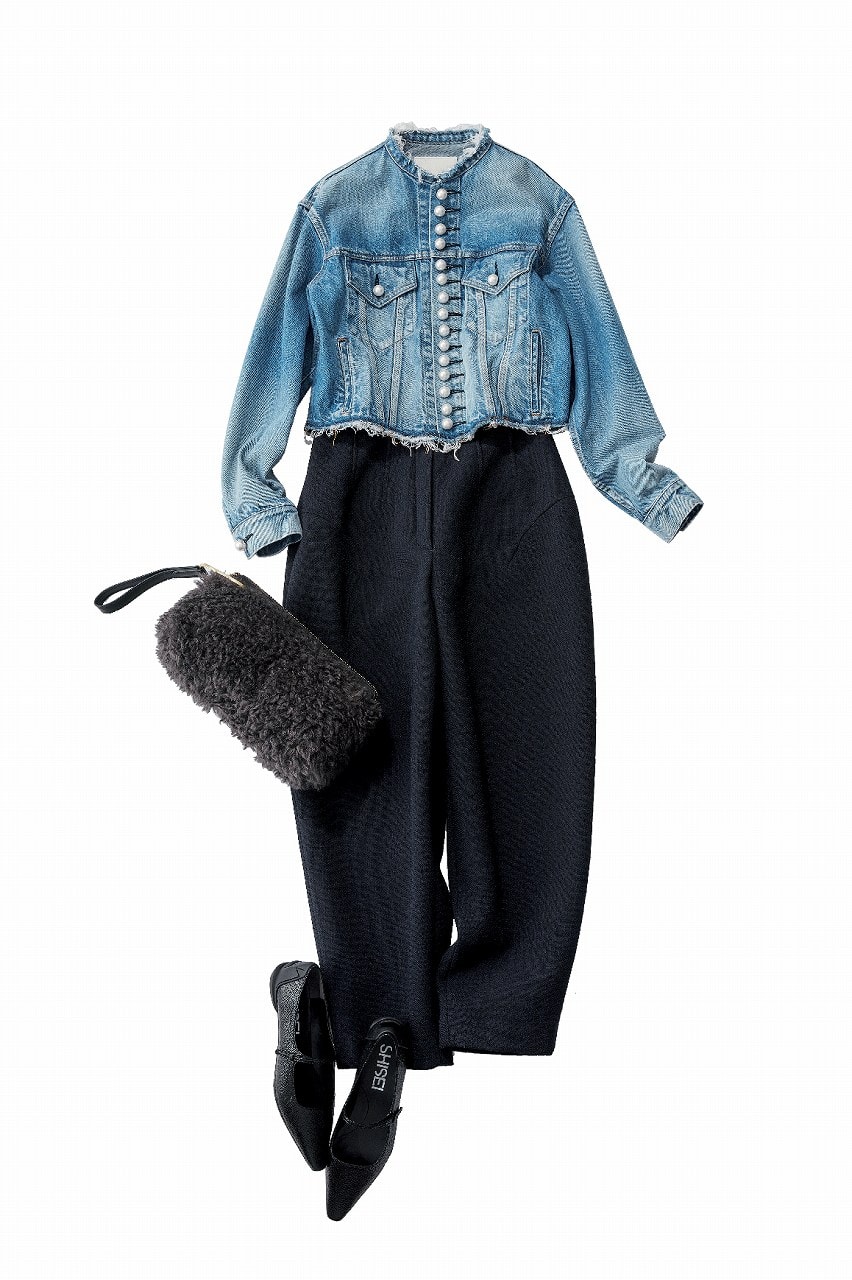 パールが効いた甘めのデニムジャケットは、黒のバレルパンツで大人っぽくシフト。トレンド感をさらっと取り入れながら洗練見えを叶えてくれるスタイルです。