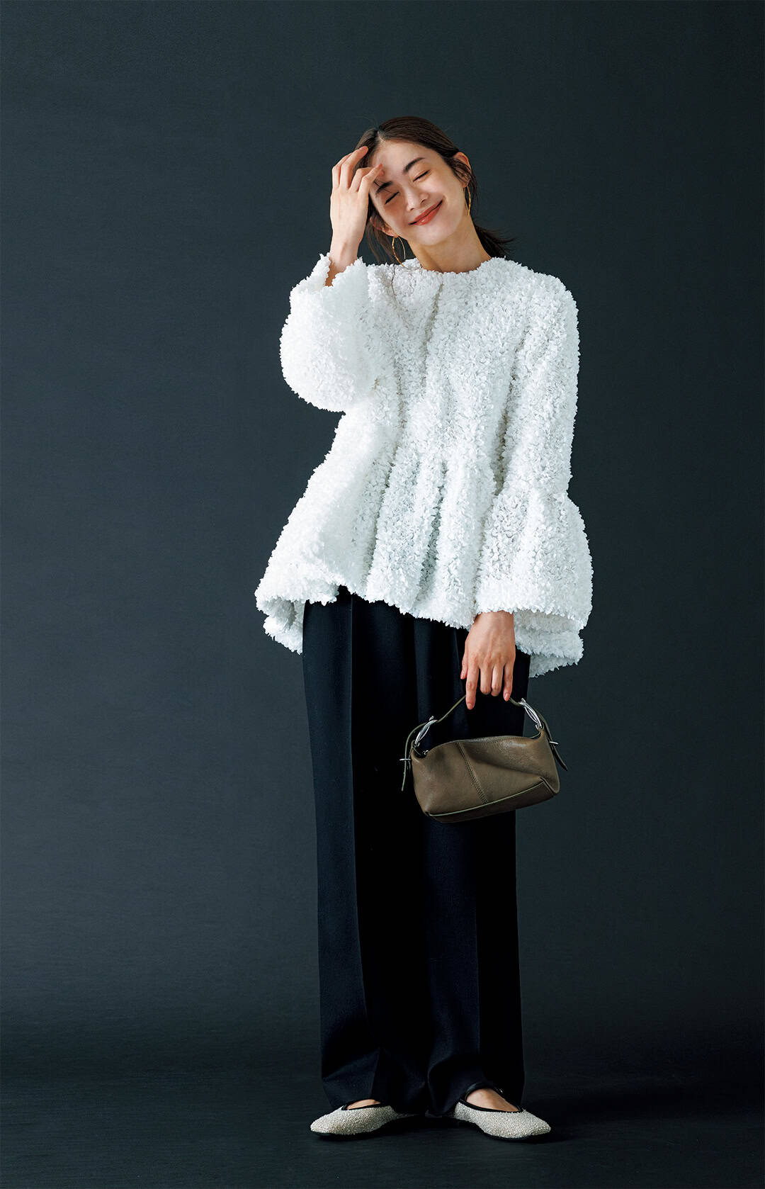 トップス¥57,200(ツル バイ マリコ オイカワ)パン¥44,000(グラフペーパー/グラフペーパー東京)バッグ¥121,000(J&M デヴィッドソン/J&M デヴィッドソン カスタマーセンター)シューズ¥11,550(ル タロン/ル タロン 有楽町マルイ店)ピアス¥32,560(ソコ/ズットホリック)