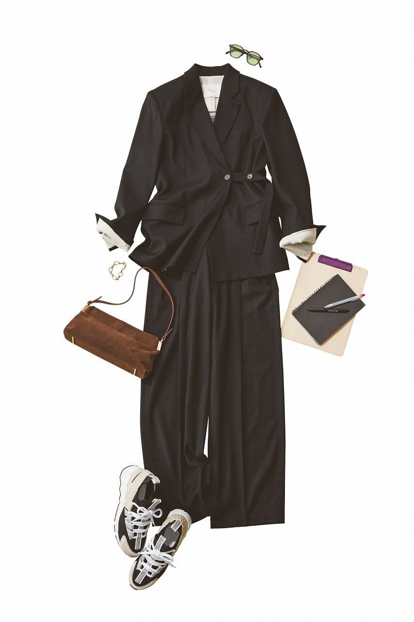 シックなセットアップも、パンツでモードにシフト