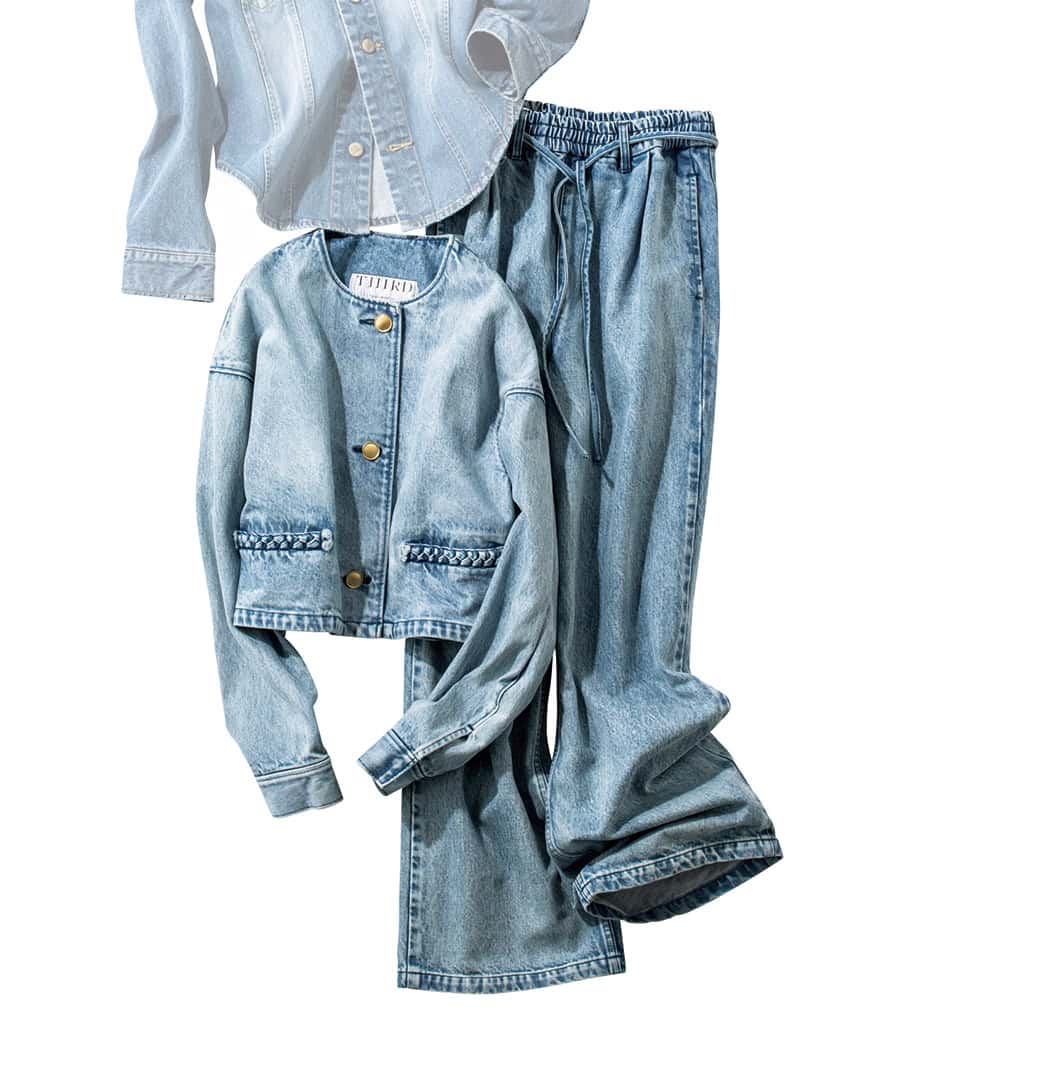 セットアップとして着こなせるフェミニンなデザインが秀逸。ジャケットはノーカラーだから顔周りも優しげ。ジャケット¥55,000イージーデニムパンツ¥47,300(ともにサードマガジン)