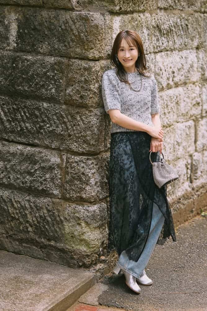 レースの巻きスカートを使うと、カジュアルなデニムコーデもたちまちお出掛け仕様に。繊細なレース素材なので「今日のコーデ、カジュアルすぎる?」という時に大活躍です!合わせるアイテムで雰囲気を変えられるのでレイヤードスタイルも奥行きが出て◎。ニットがシルバーラメ入りなので、ショートブーツとバッグもシルバーで合わせ、大人のお出掛けスタイルに仕上げました。