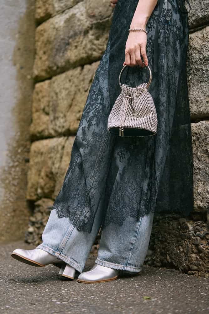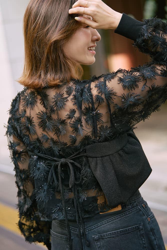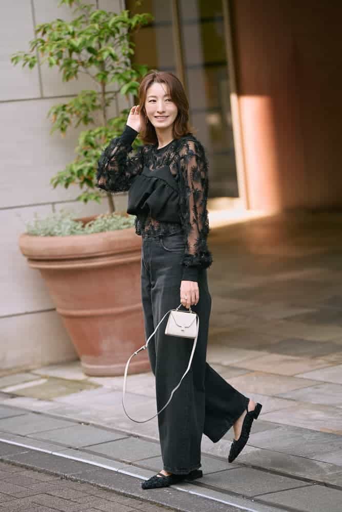 レースブラウスはスパンコール付きで、キレイめスタイルやドレスアップDayにも大活躍。去年は1枚で着ていましたが、今季はトレンドのビスチェをレイヤードしてアップデートしました。立体的なシルエットで存在感のあるビスチェを合わせることで、ほぼクロコーデにも奥行きが生まれ、華やかに決まります。デニムでカジュアルダウンし、Valextraのベルトバッグを合わせれば、大人の女子会コーデの完成です。