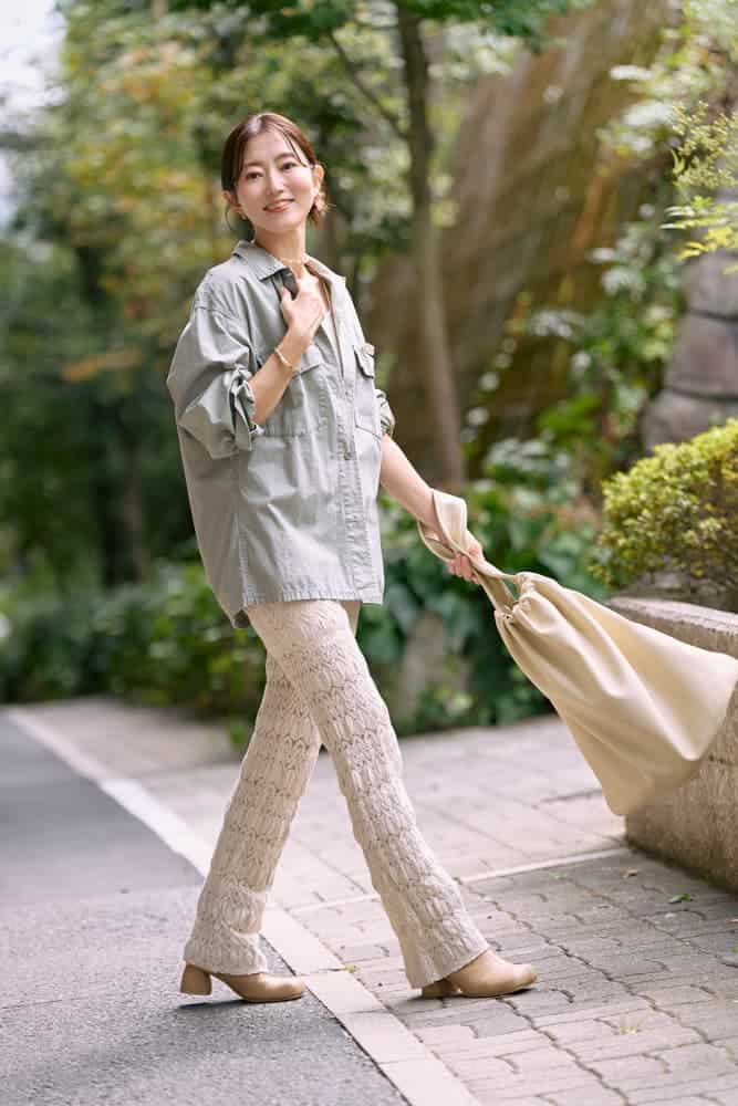 コーデの鮮度が上がるレースパンツは、ミリタリージャケットと合わせて甘さを軽減し、大人カジュアルにまとめました。甘め要素の強いレースは、辛口アイテムと合わせることで大人っぽく仕上がり、ヘルシーな印象に見せることができます。さらに優しげカラーでまとめれば、大人の抜け感ある華やかコーデに。