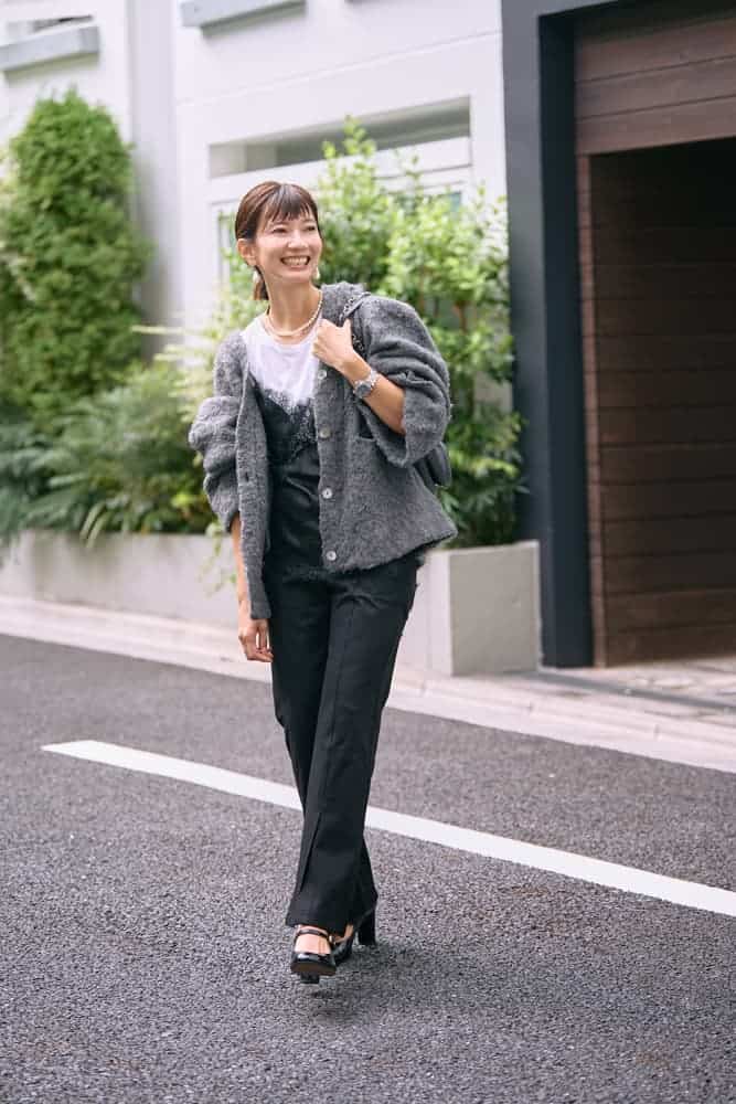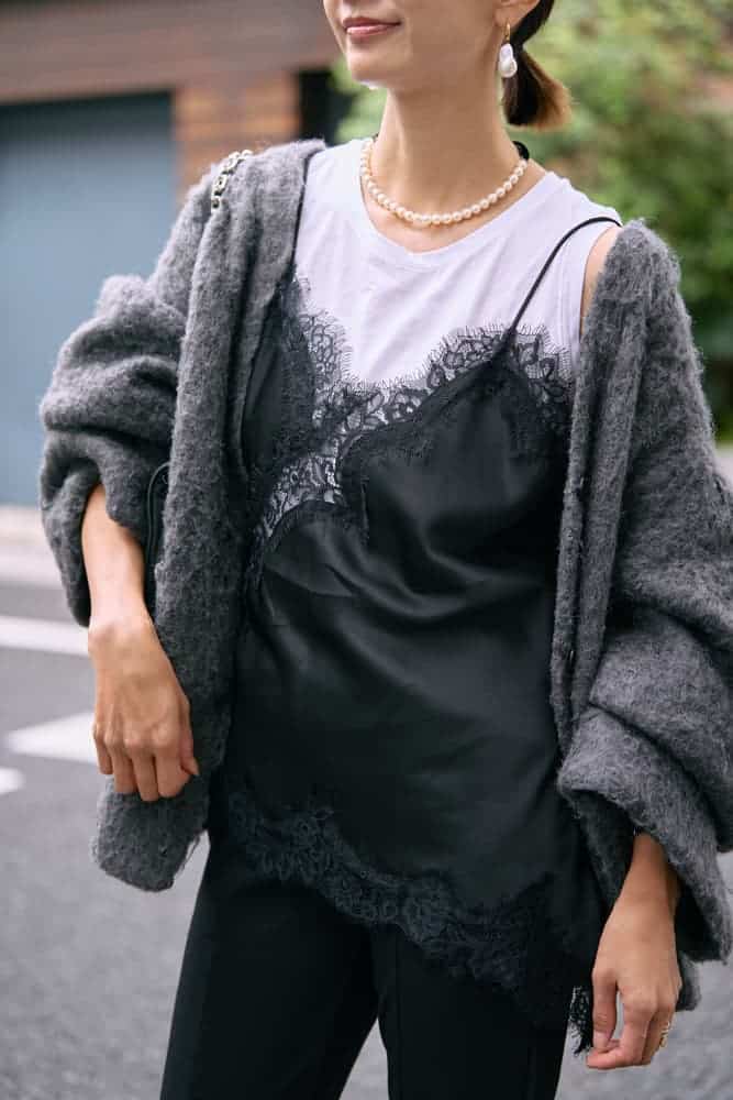 最近よく見かけてZARAで購入したレースキャミは、裾のアシンメトリーなデザインがポイント。1枚で着るのはもちろん、裾だけをニットなどから覗かせるレイヤードスタイルもオススメです!甘くなりすぎないよう、ざっくりカーディガンをラフに羽織ってバランスを調整しました。まとめ髪やパールアクセサリーなど、合わせ方で印象を変えることができるので、自由な着回しを楽しめそうです。
