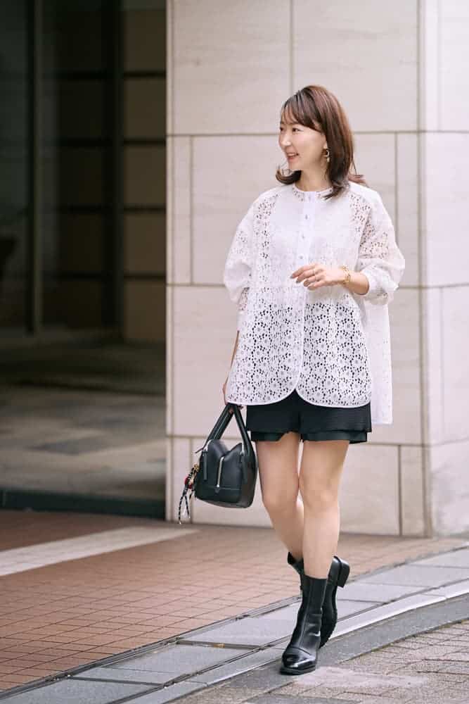 甘すぎない大人のレースシャツは、立体感のある上品なレースが甘ニッシュ派に嬉しい!と購入しました。前後差のあるシルエットや、ころんとした形が可愛いくるみボタンもお気に入り。ショートパンツ×ブーツで秋らしくまとめ、モノトーンで甘さをほどよく抑えました。カジュアルに合わせても可愛いので、レイヤードやデニム合わせで表情を変えながら、秋冬も長く楽しみたいです。
