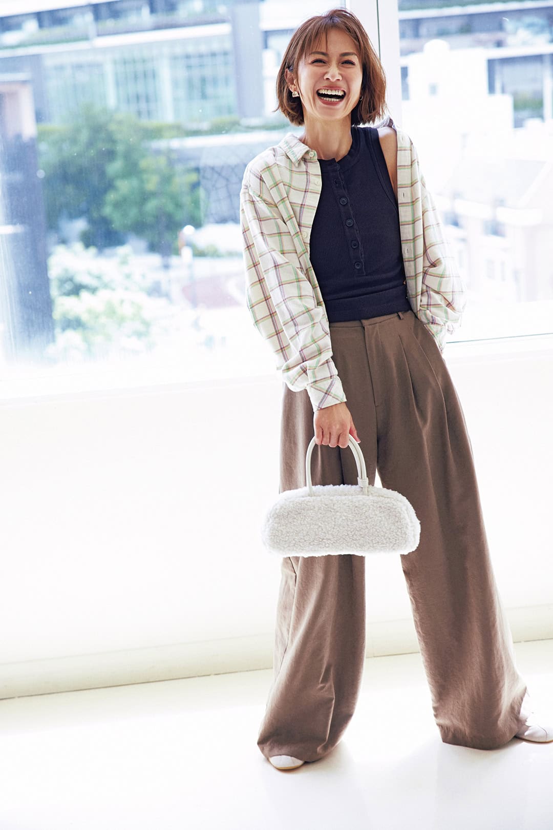個性的で遊び心のあるブランドの今年らしい落ち感のあるワイドパンツ。一見、洗えなそうな上質見えする素材が魅力。ワイドパンツ×チェック柄でカジュアル慣れした人になりきって。見かけによらずイージーケアなパンツなら汚れも汗も気にせず、長い残暑もたっぷり着倒せます。